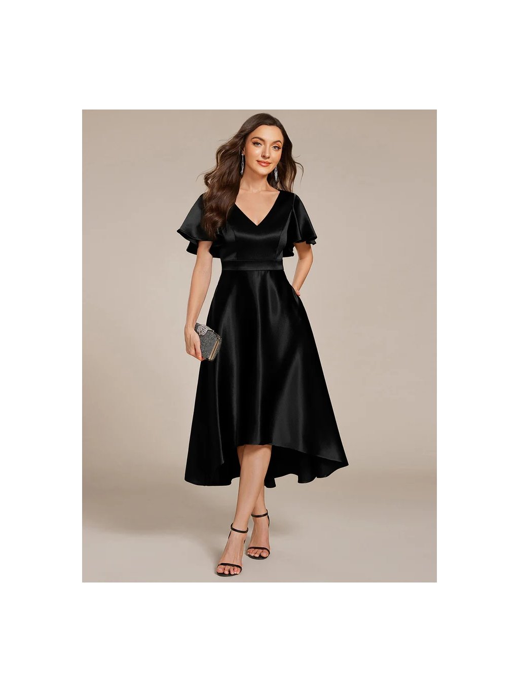 Společenské šaty saténové Ever Pretty. Šaty mají krátký rukáv, na prsou mají velký výstřih. Sukně je bohatá, s kapsami