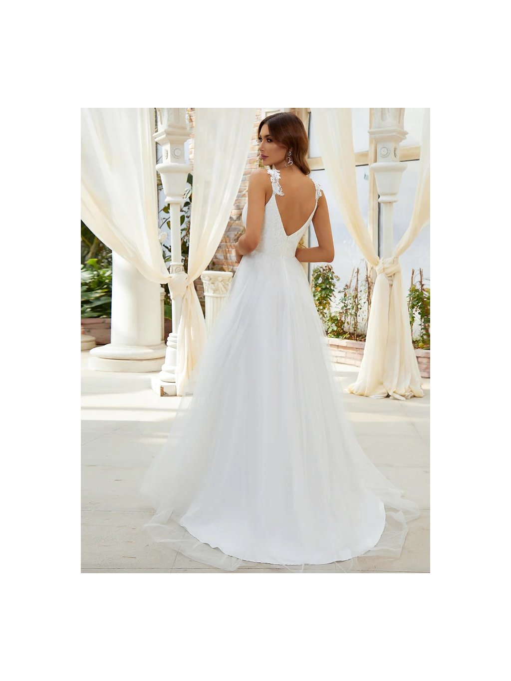 Úchvatné svatební šaty Ever Pretty. Šaty mají krajkovaný top s špagetovými rukávy. Šaty zdobené výšivkou