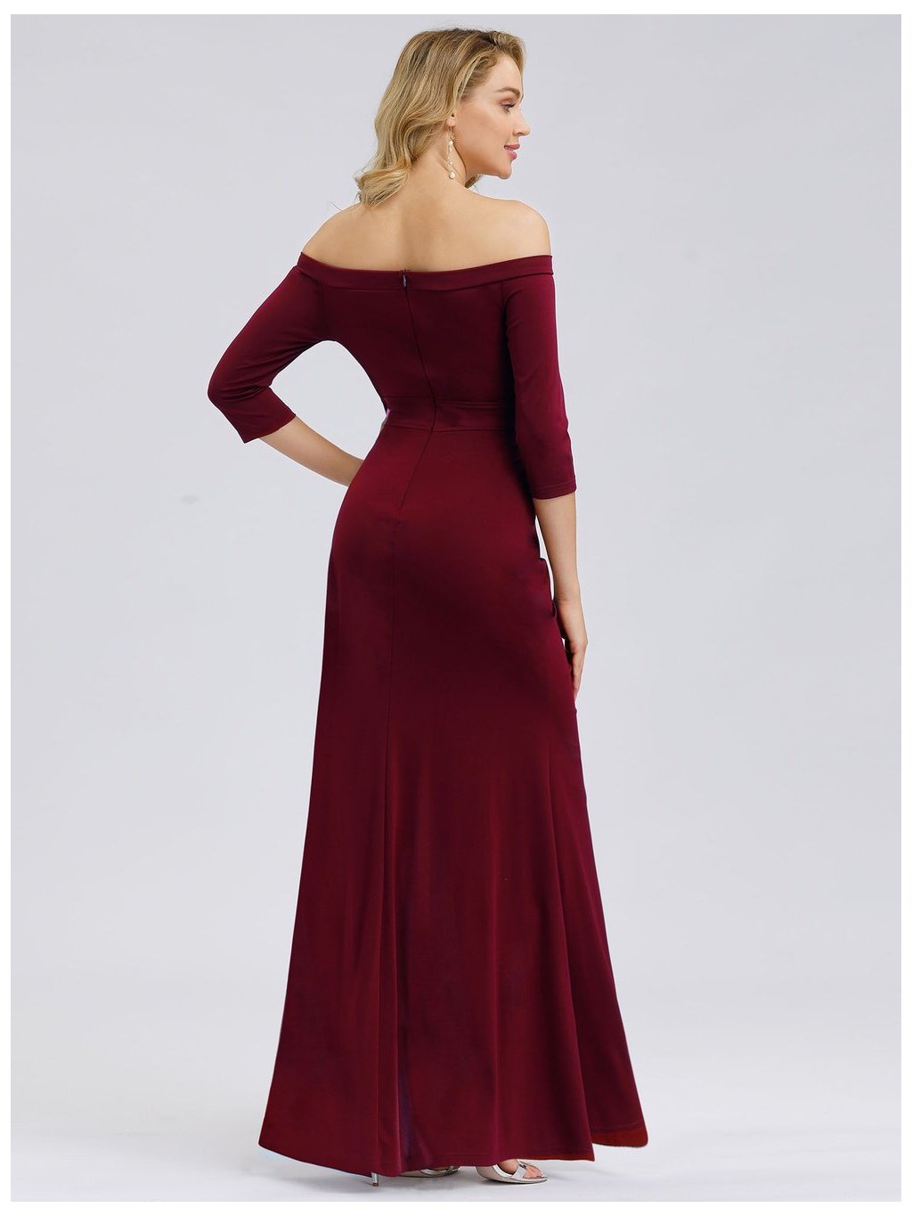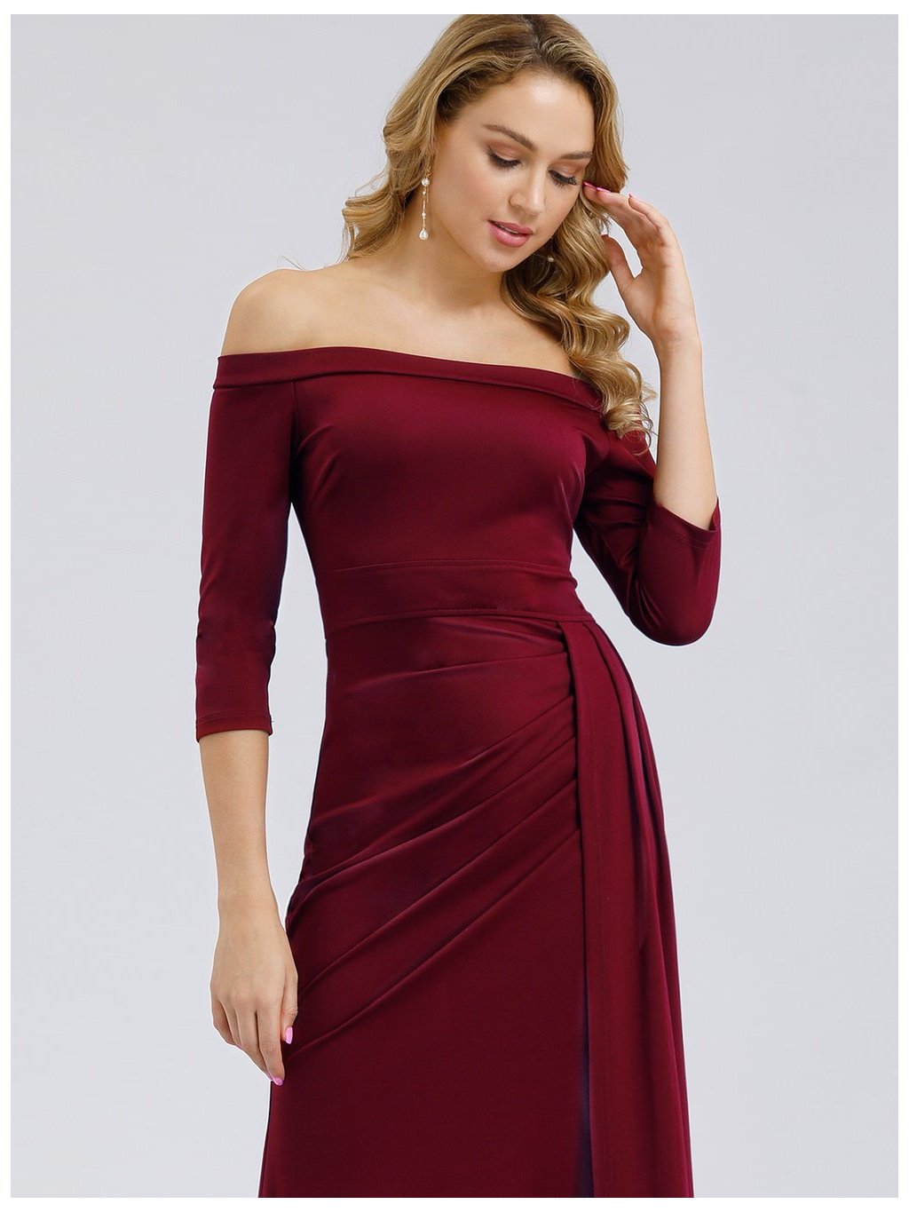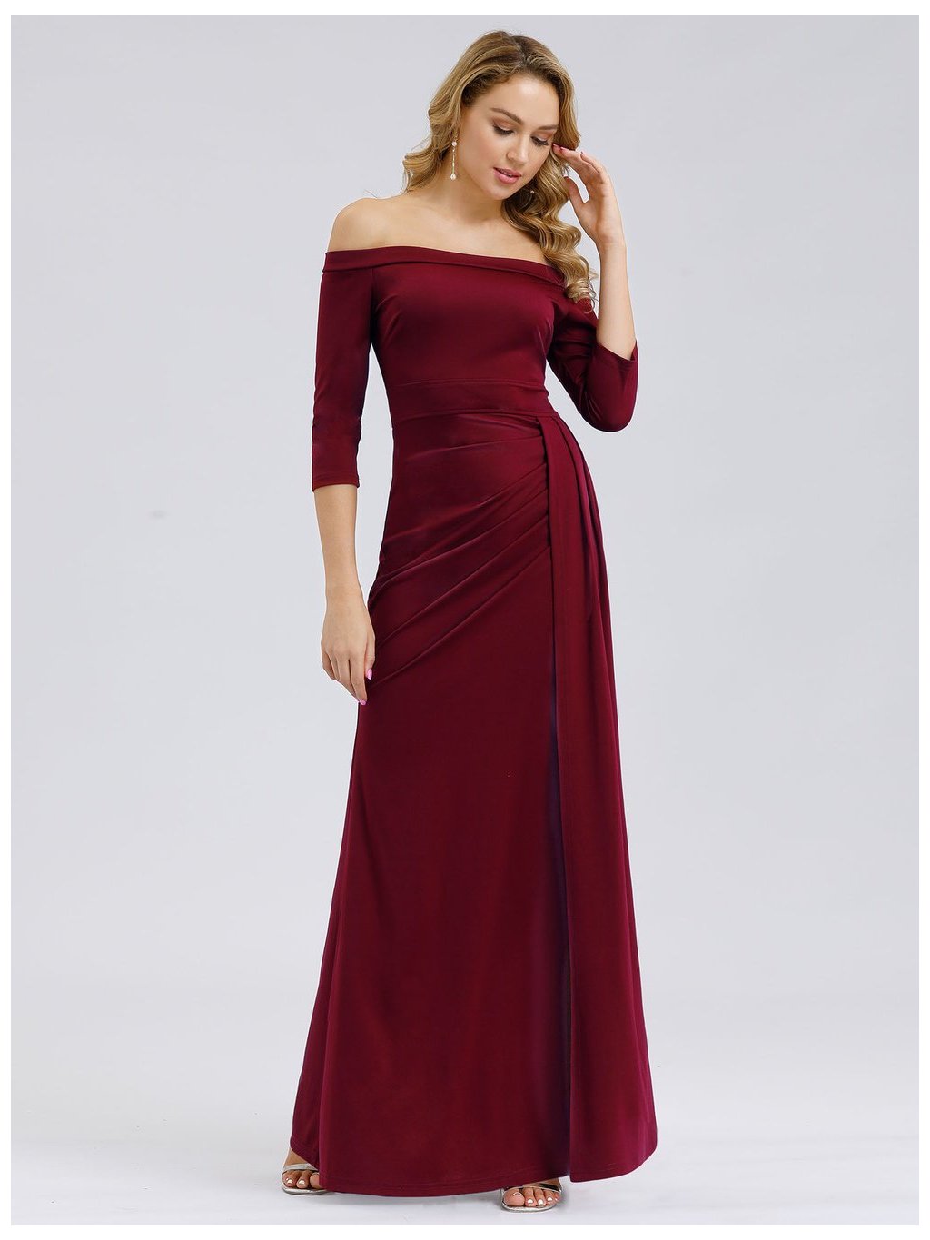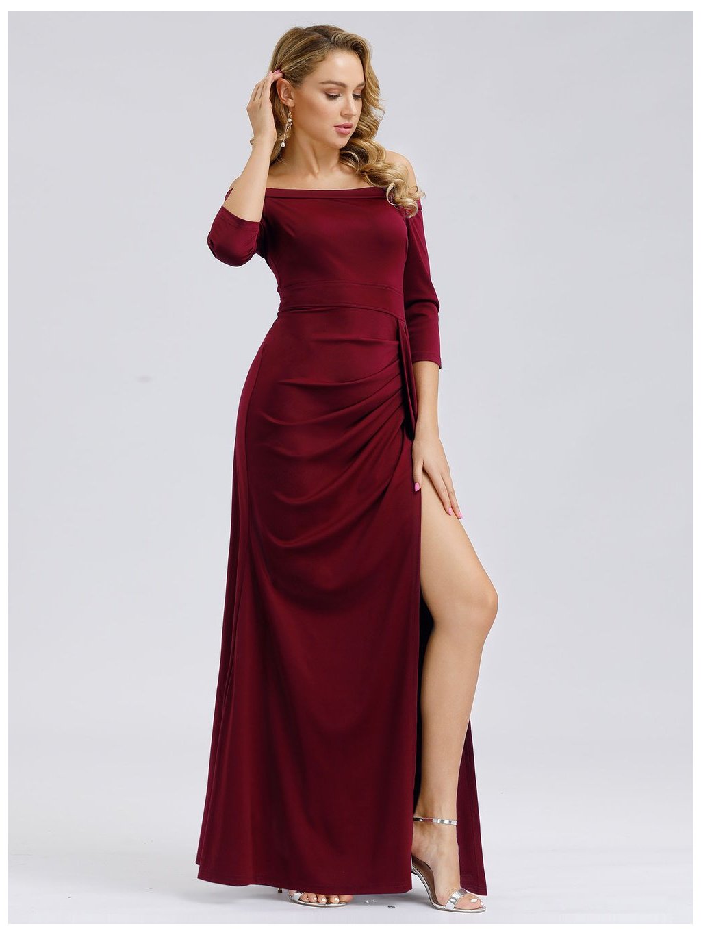 Bordo šaty Ever Pretty. Šaty mají holá ramena a tříčtvrteční rukáv. Na zádech mají skrytý zip. Sukně má velký rozparek.