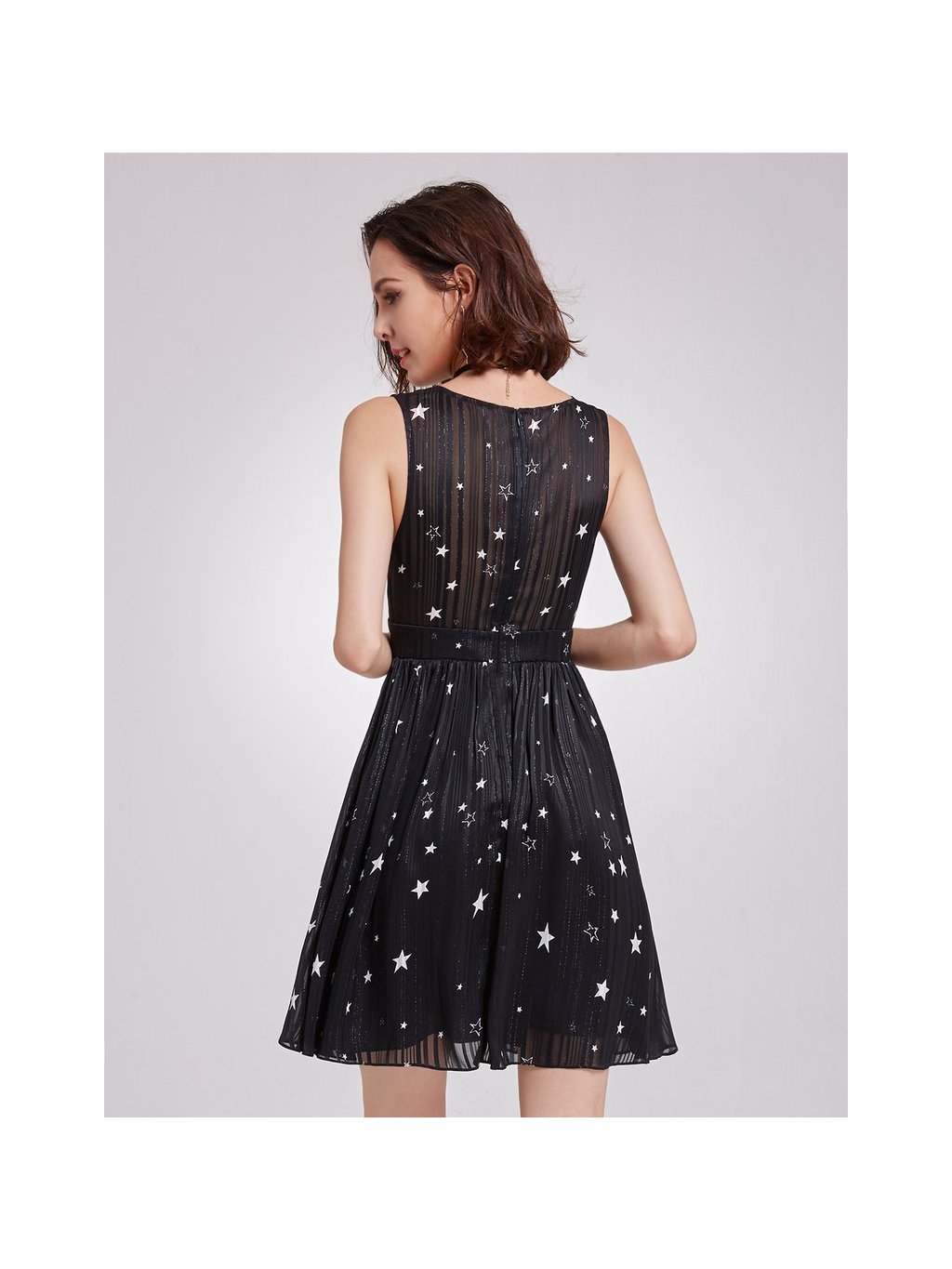 Krásné letní šaty, vhodné do společnosti. Šaty mají véčkový výstřih, skrytý zip na zádech. Široká ramínka. Barva černá a bílé hvězdičky. Šaty jsou prošity stříbrnou nitkou.