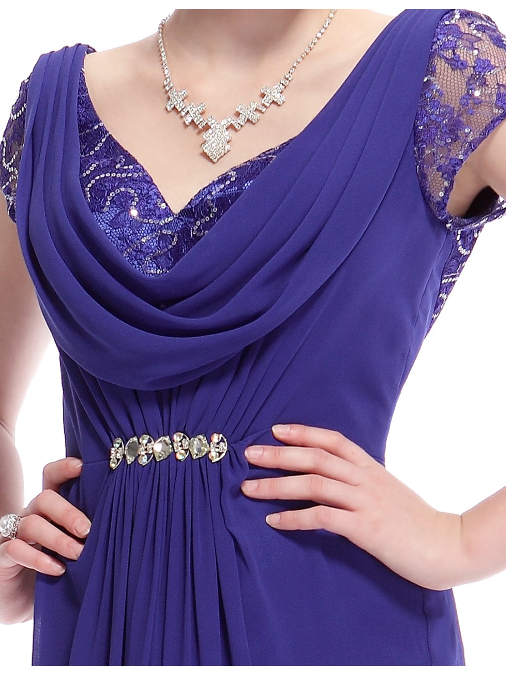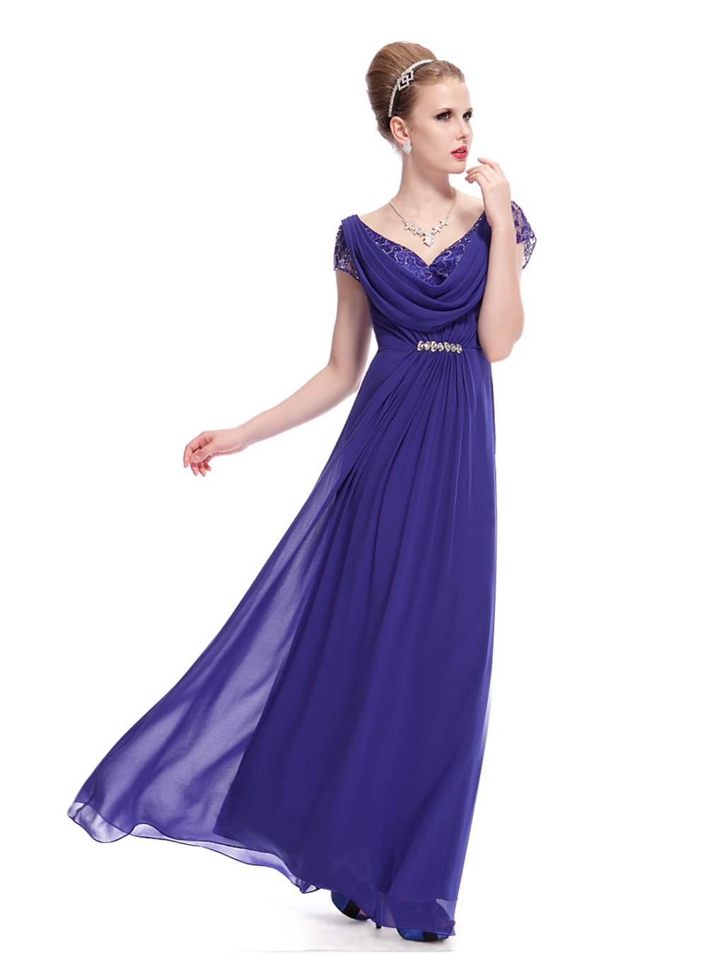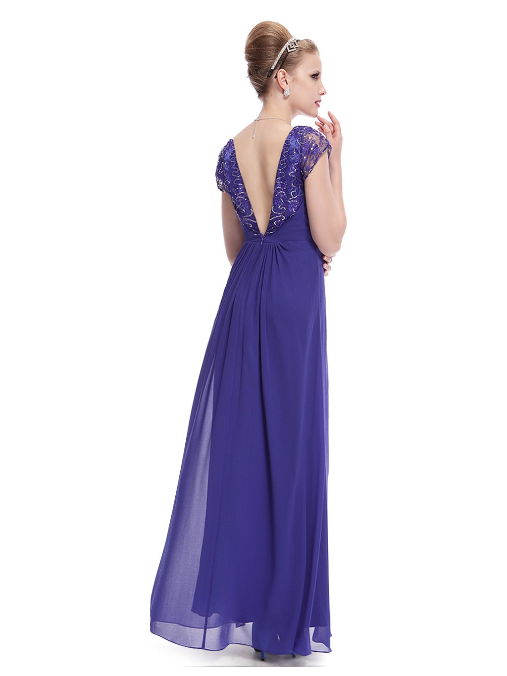 Modré šaty jsou na široká ramínka s krátkým rukávkem. Šaty jsou ve výstřihu zdobeny flitry a volánkem. Na zádech mají hluboký výstřih. V pase mají ozdobnou sponu.
