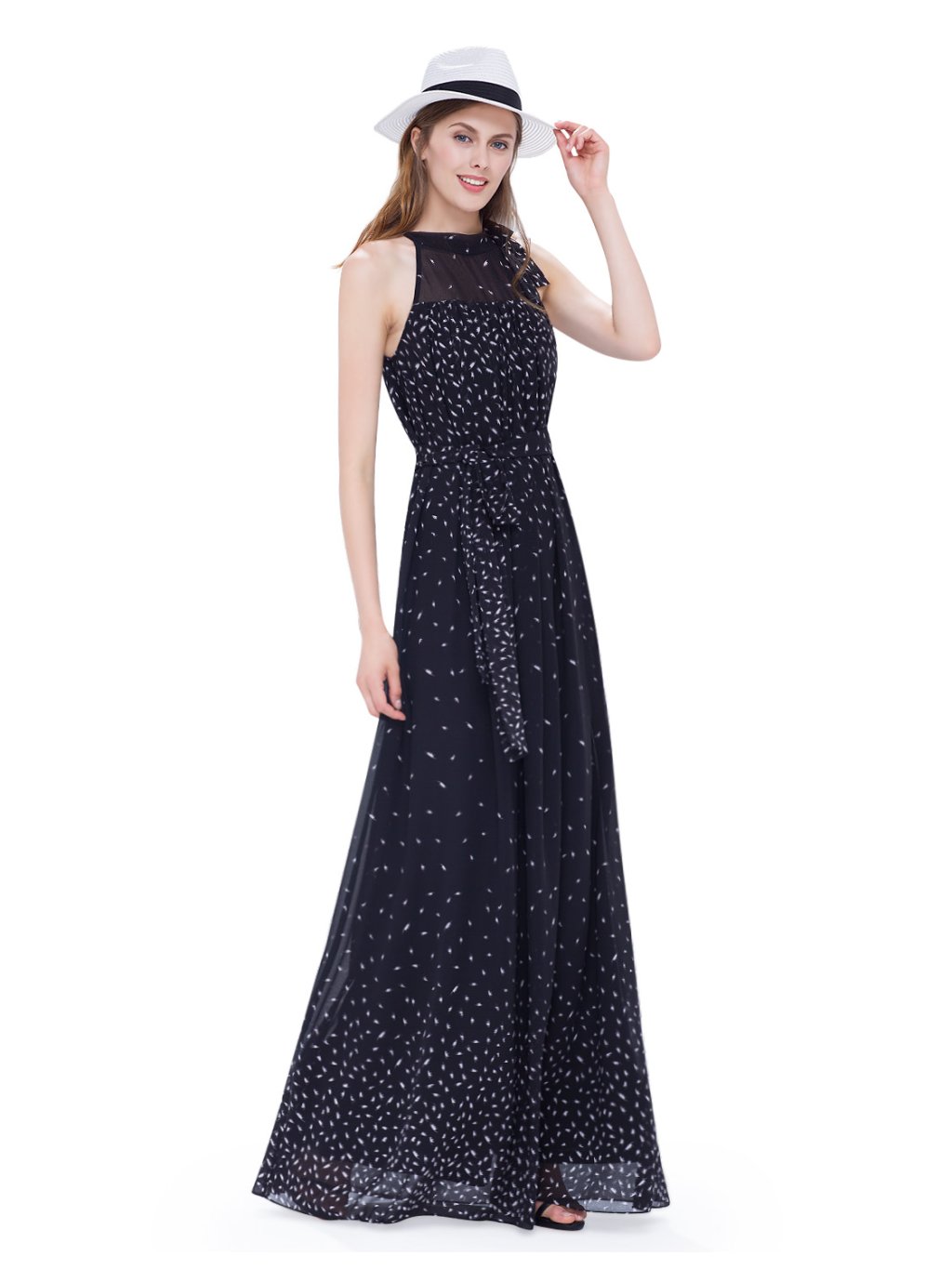 Dlouhé letní šaty Ever Pretty černé barvy. Šaty jsou bez rukávů, nemají výstřih. Na zádech mají skrytý zip. V pase jsou na zavázání. Vzor bílá pírka.