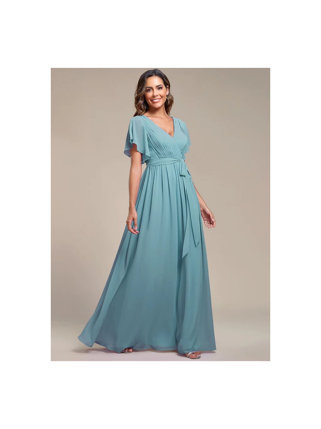 Zelené šifónové šaty s rukávky. Véčkový výstřih v předu, v zadu kulaty.Pásek jde v zadu stáhnout mašlí Tento model je naprosto dokonalý ve své jednoduchosti. Sedí většině postav a velikostí.