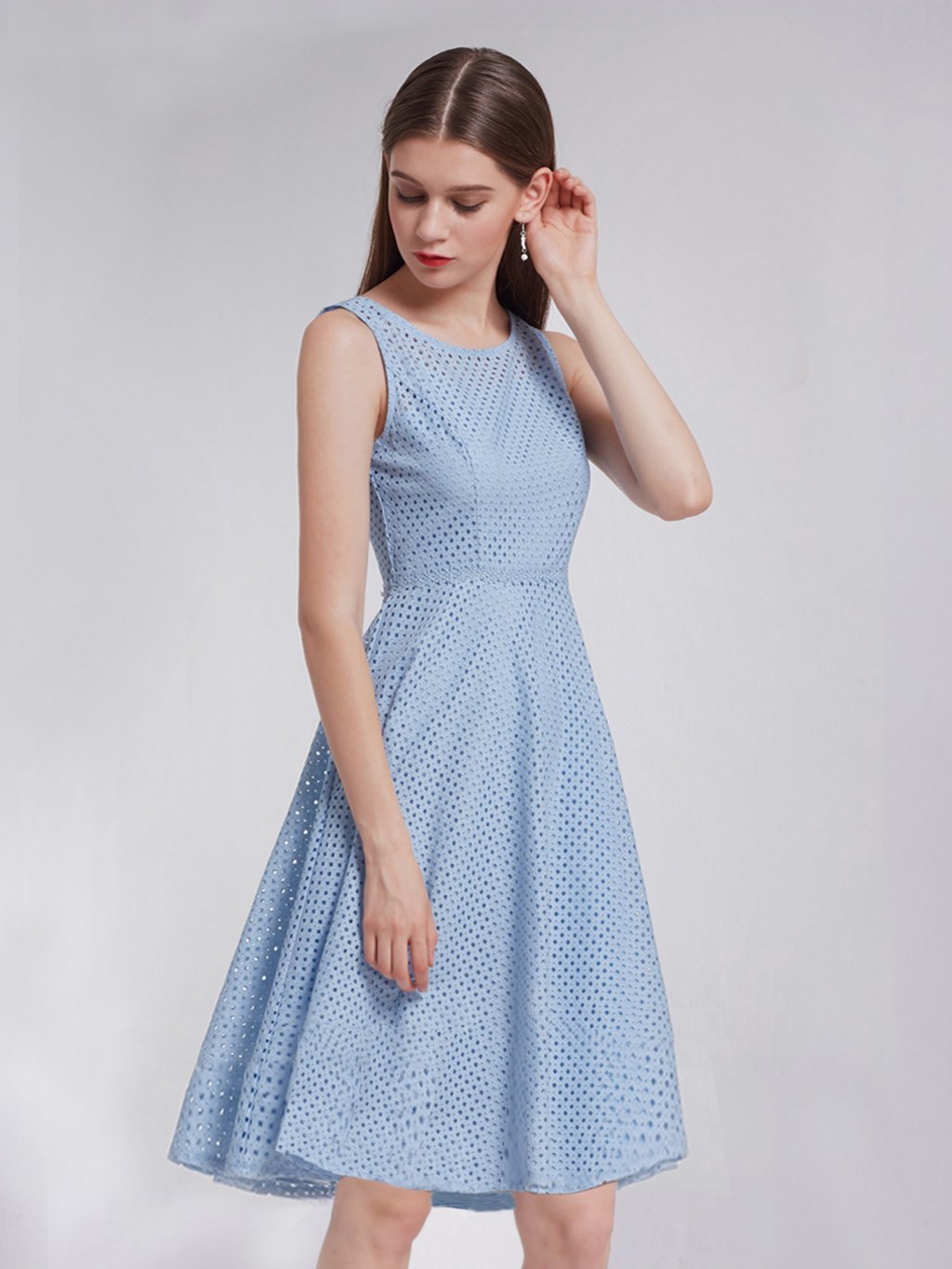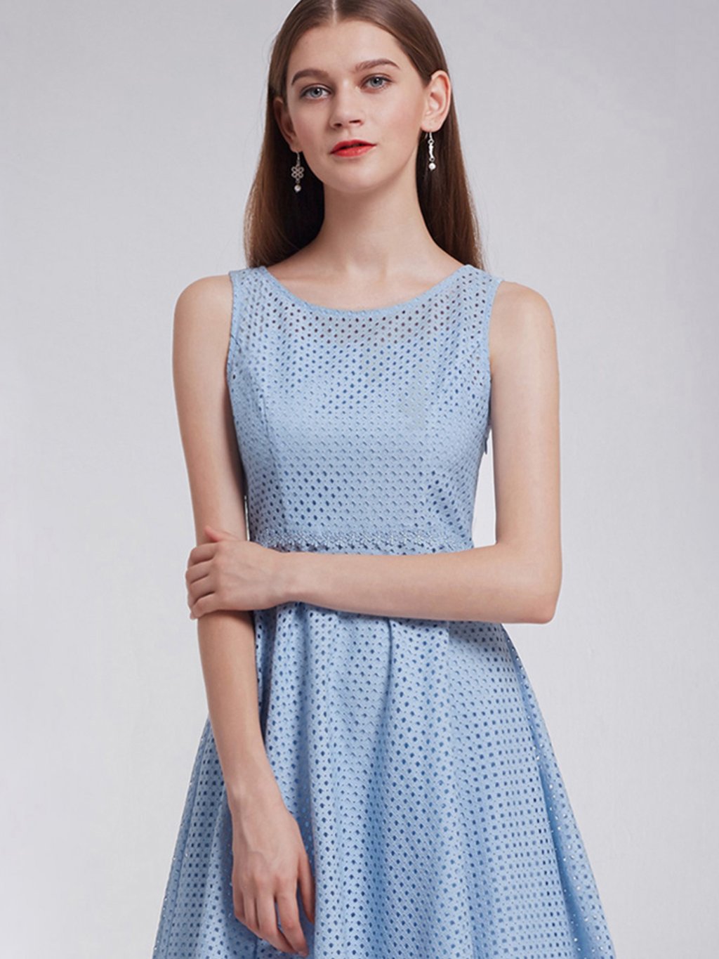 Novinka. Krásné krátké světle modré šaty na široká ramínka. Šaty jsou děrované, mají podšívku stejné barvy..Lodičkový výstřih. Jsou z velmi příjemného a lehkého materiálu. V pase jsou zdobené kytičkami.