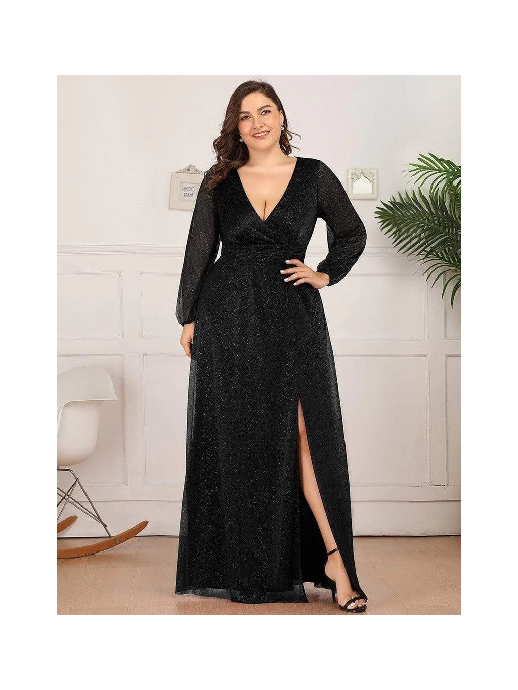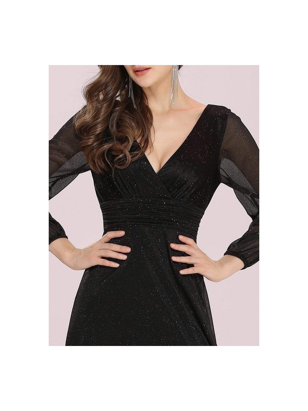 Úchvatné plesové šaty Ever Pretty. Šaty mají dlouhé průhledné rukávy. Na prsou véčkový výstřih. Sukně má rozparek. Celé šaty jsou posypány třpytkami.