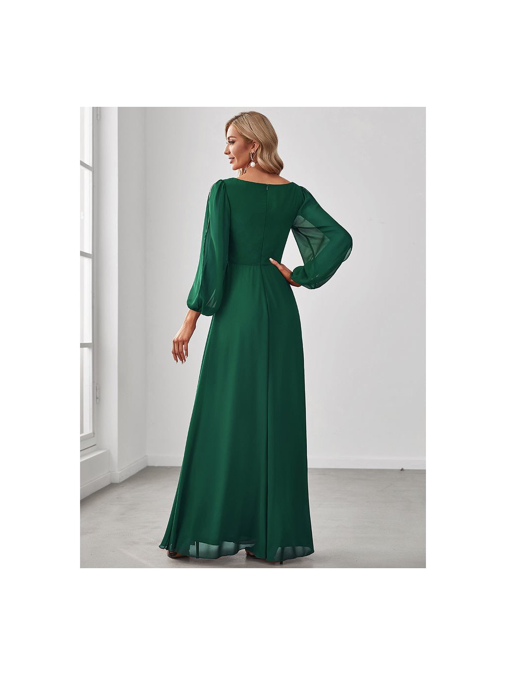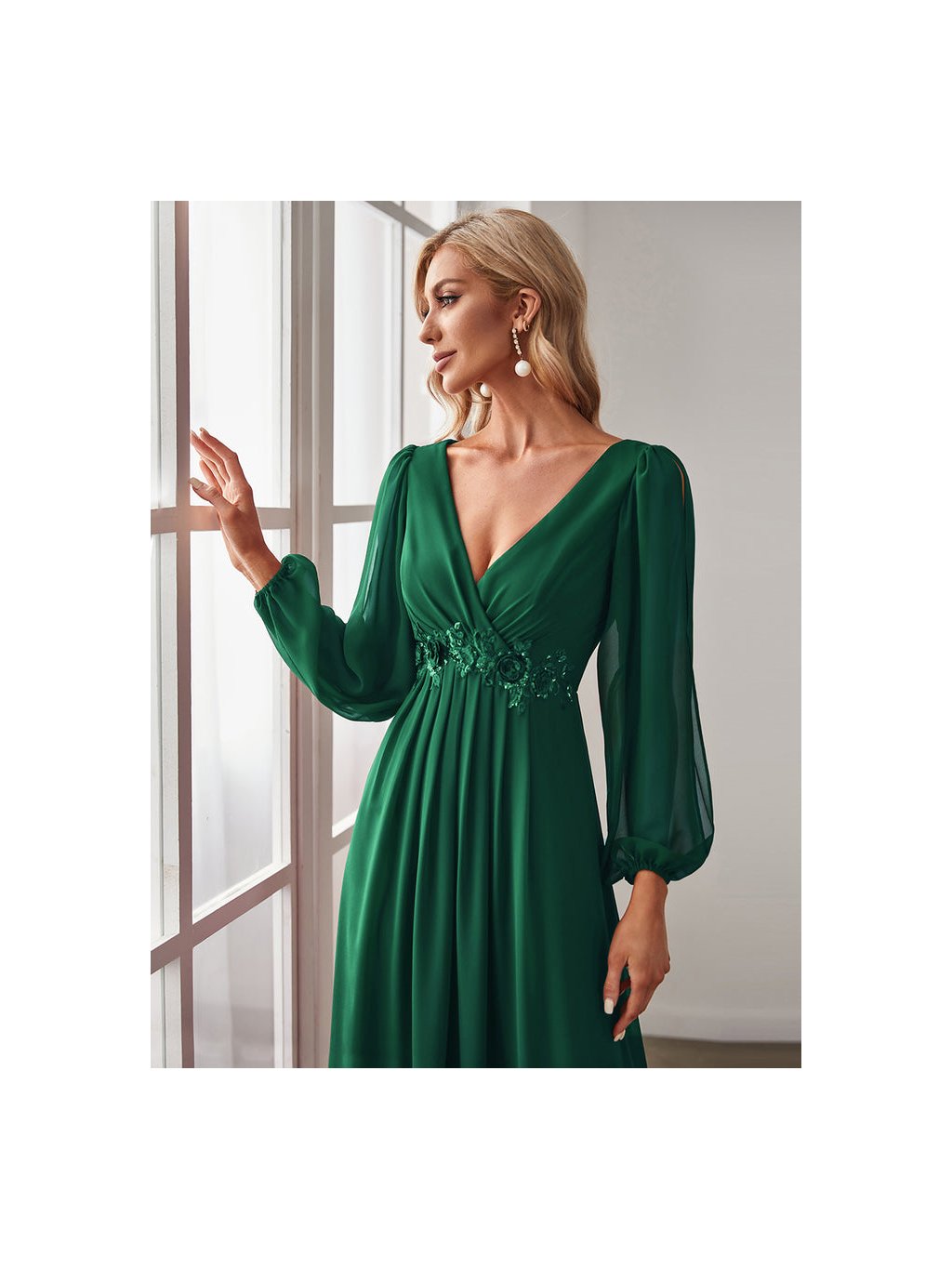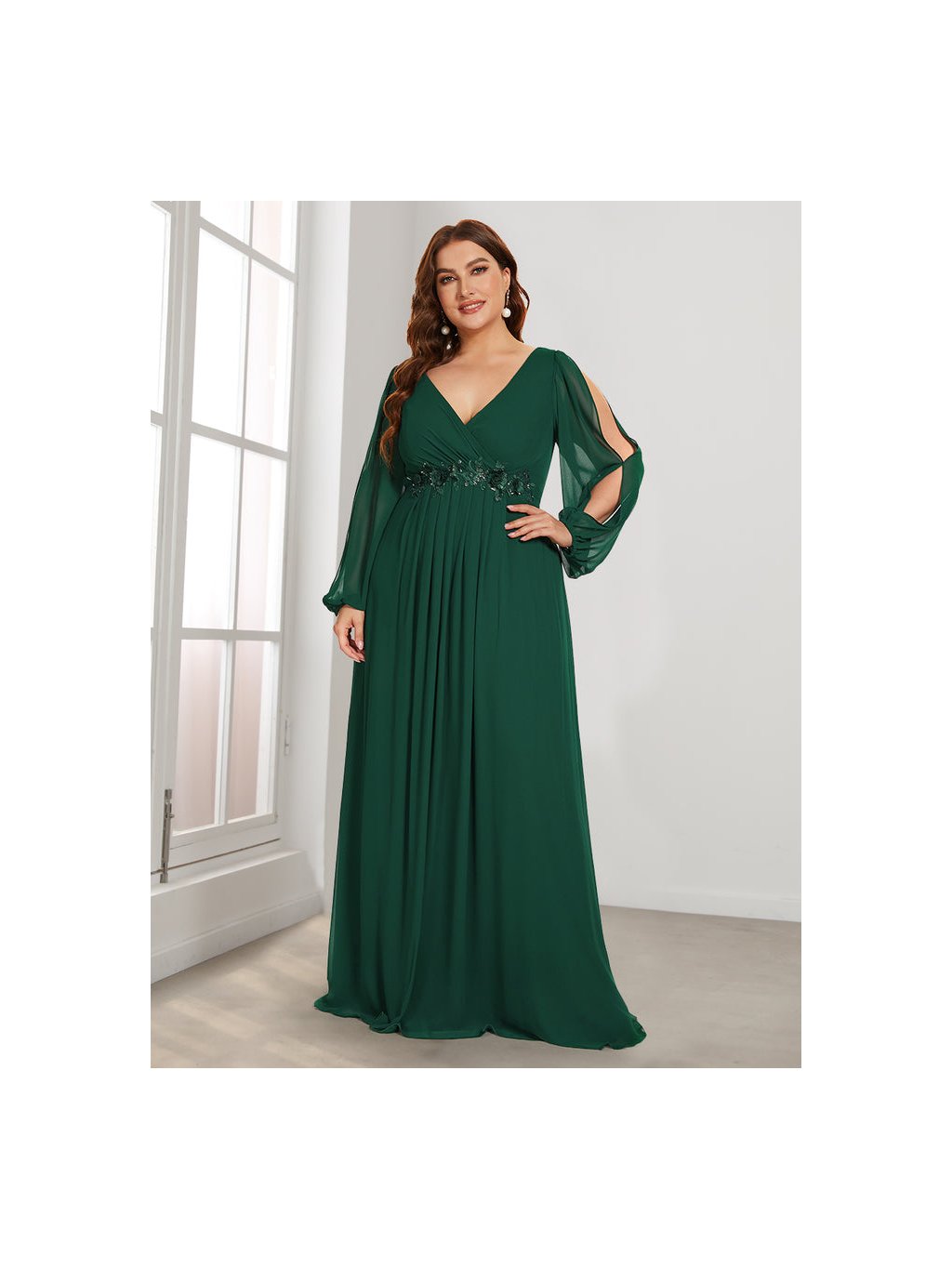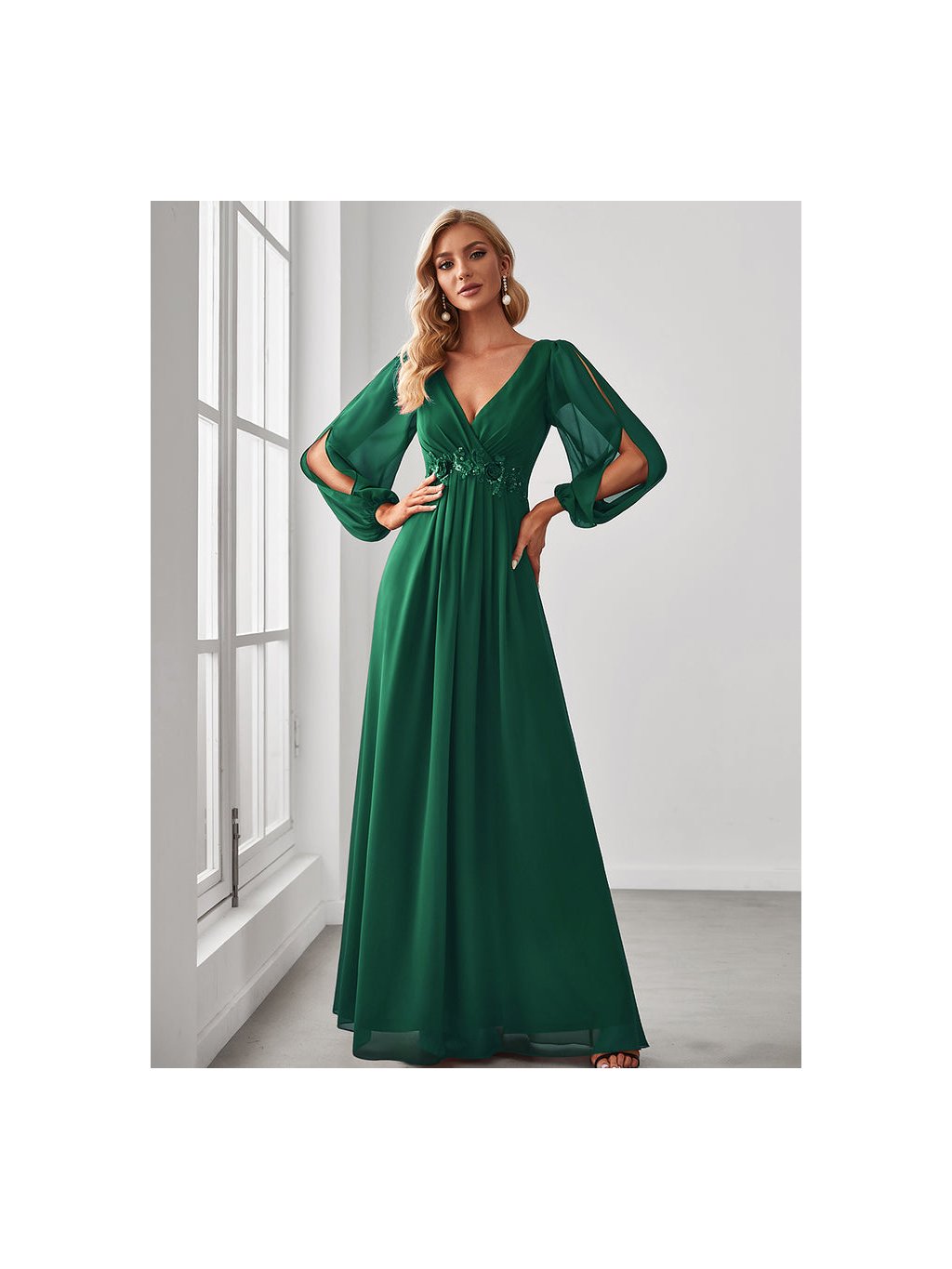 Úchvatné plesové šaty Ever Pretty. Šaty mají dlouhé prostřižené rukávy. Na prsou véčkový výstřih.
