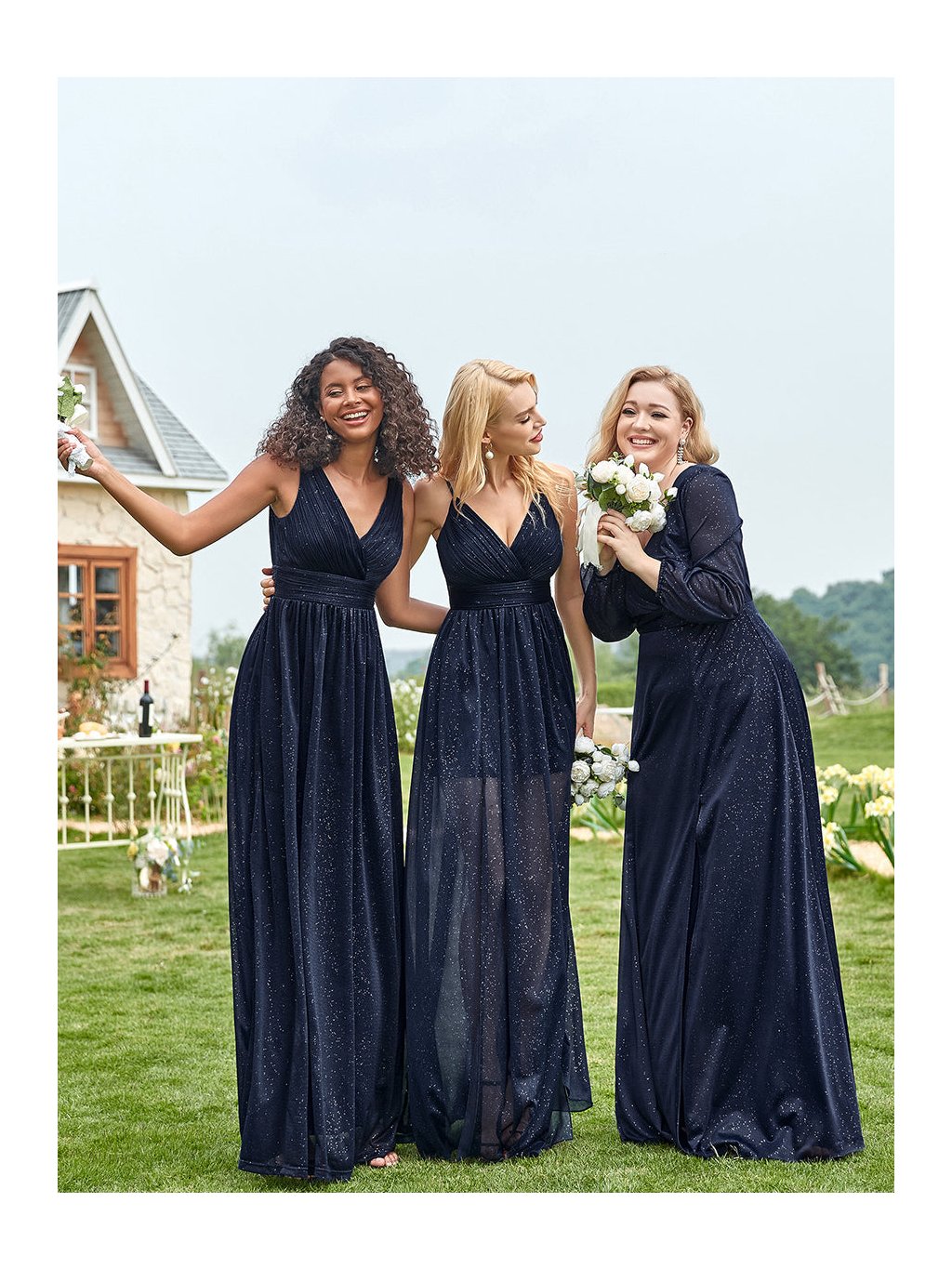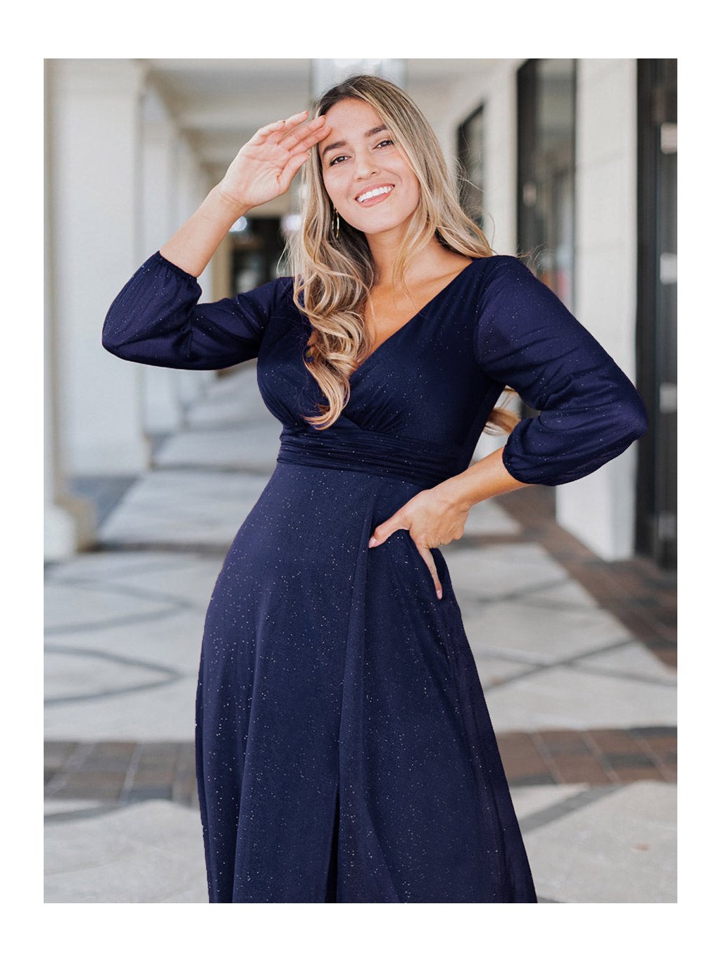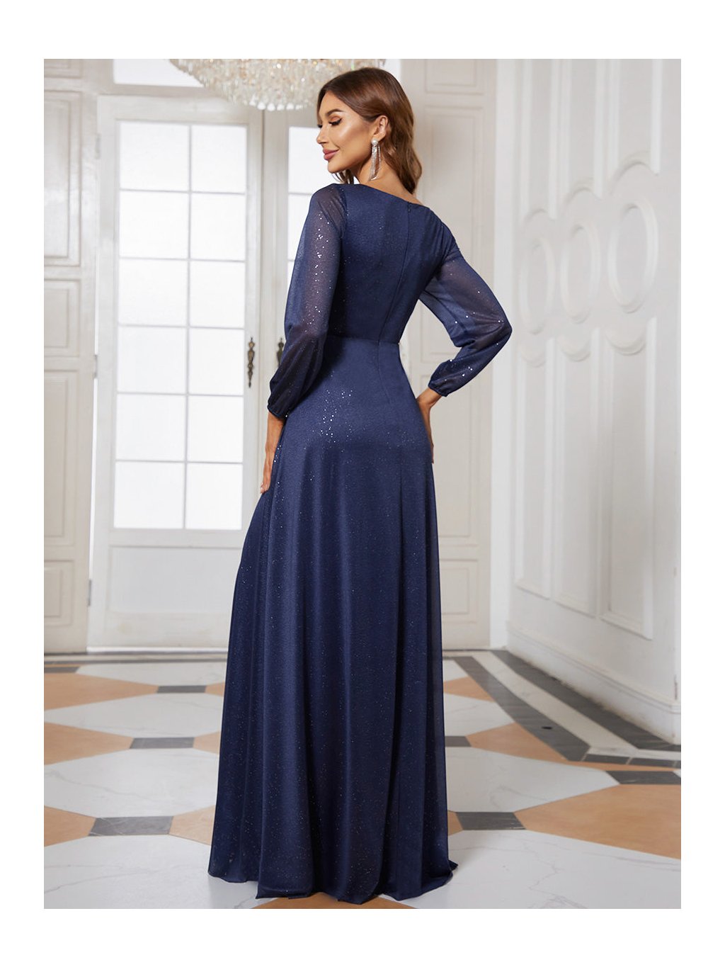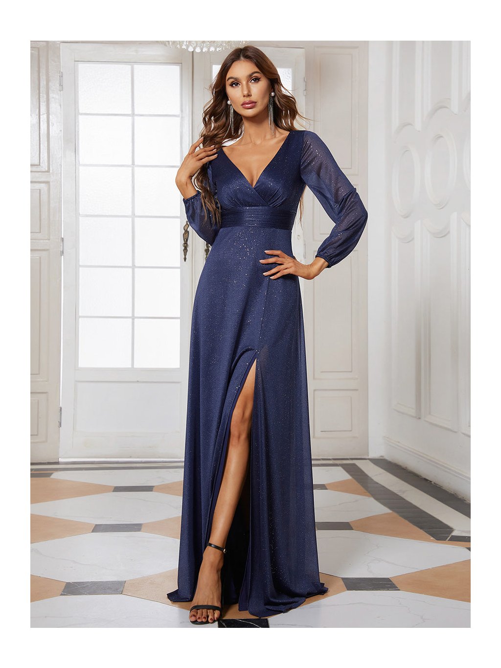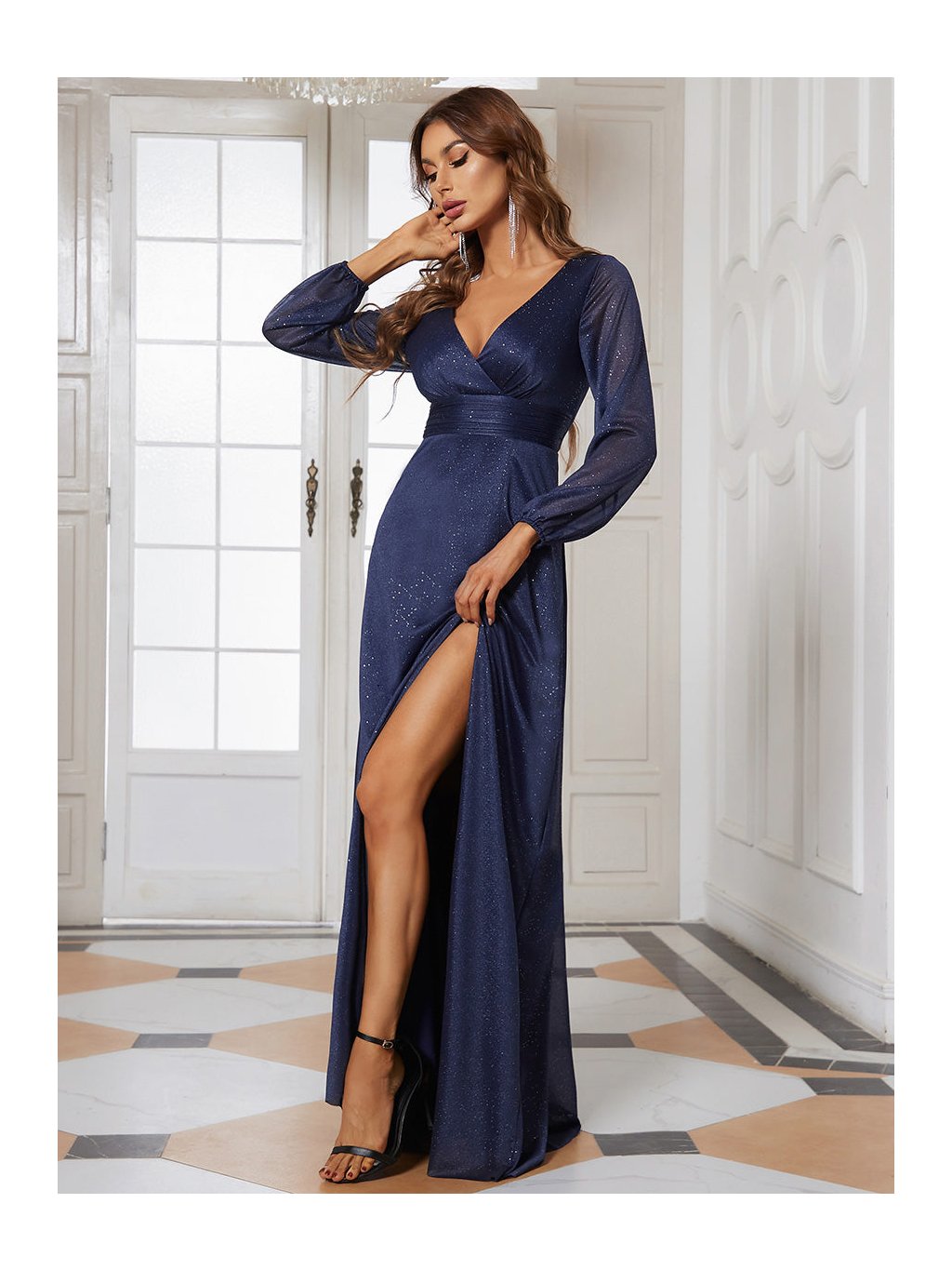 Úchvatné plesové šaty Ever Pretty. Šaty mají dlouhé průhledné rukávy. Na prsou véčkový výstřih. Sukně má rozparek. Celé šaty jsou posypány třpytkami.