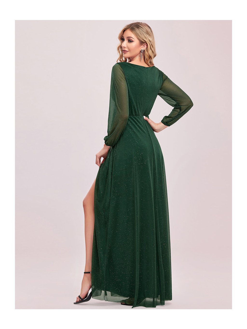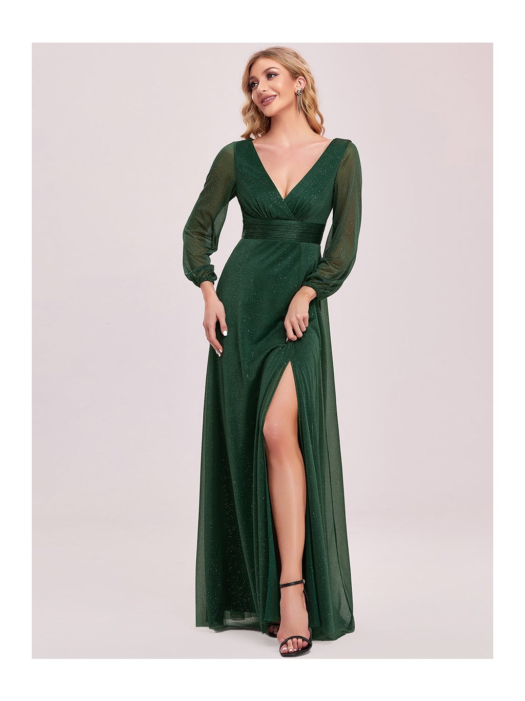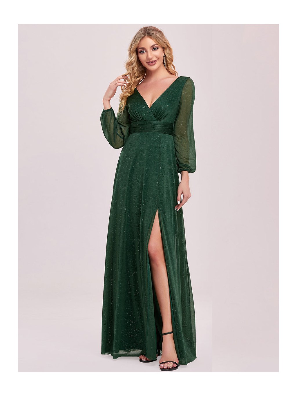 Úchvatné plesové šaty Ever Pretty. Šaty mají dlouhé průhledné rukávy. Na prsou véčkový výstřih. Sukně má rozparek. Celé šaty jsou posypány třpytkami.