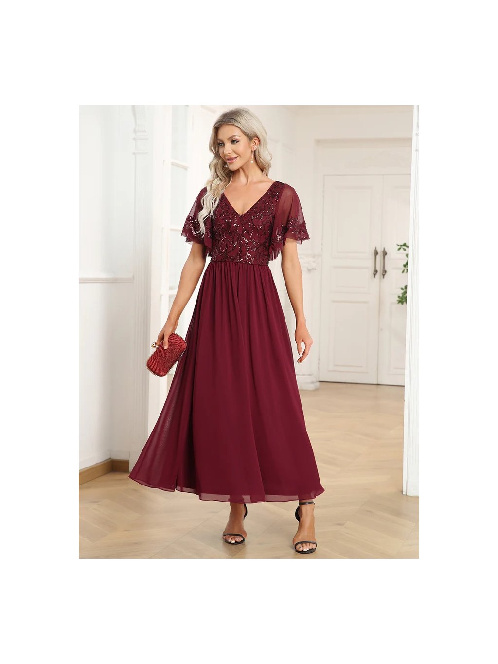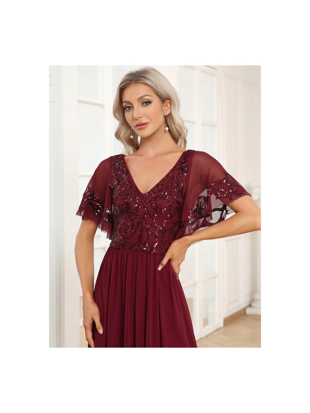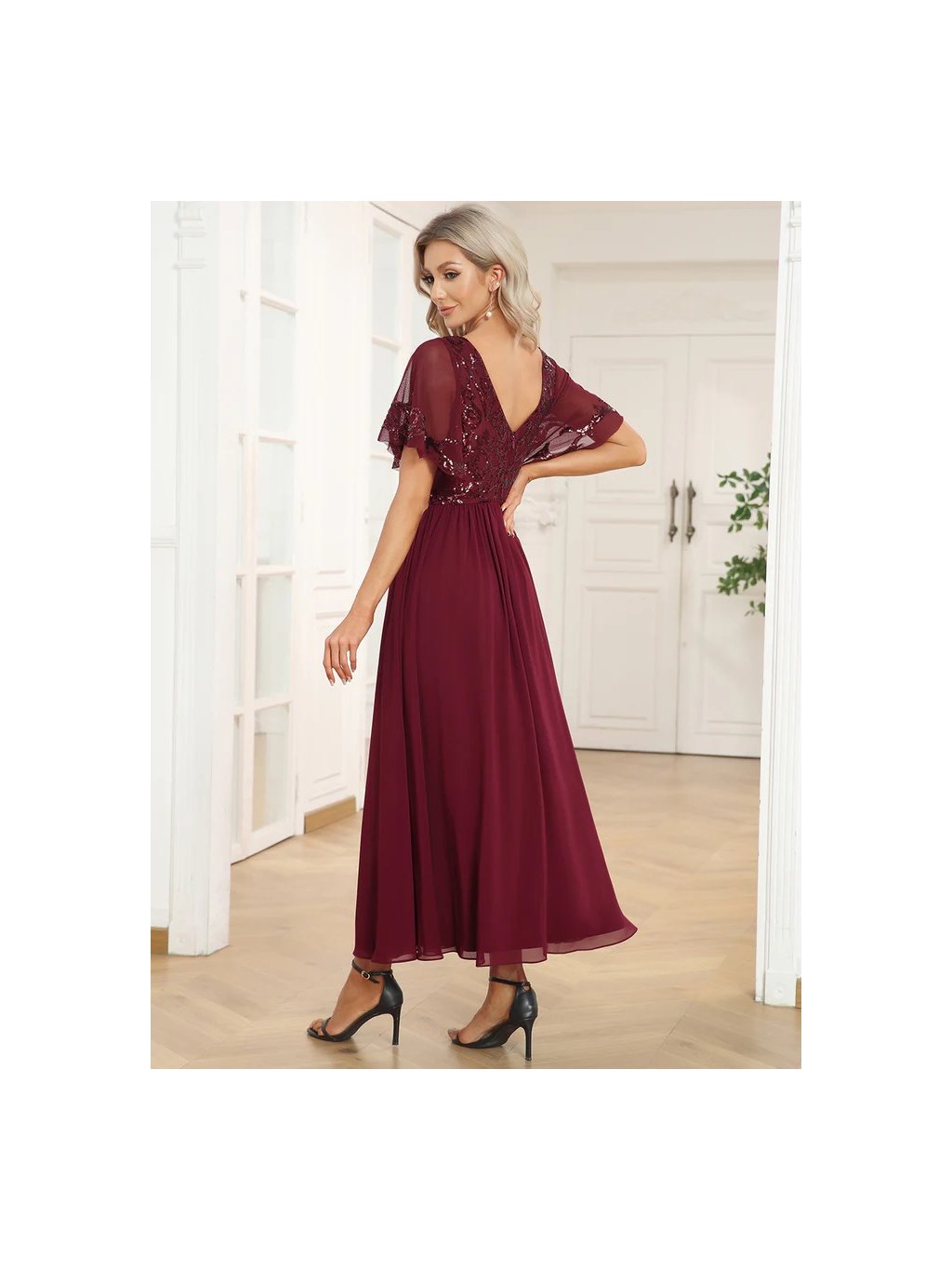 Šaty mají krátké volné rukávky. Na prsou i zádech je lodičkový výstřih. Vrchní díl je vyšívaný. Šatičky mají skrytý zip na zádech a nemají vycpávky.