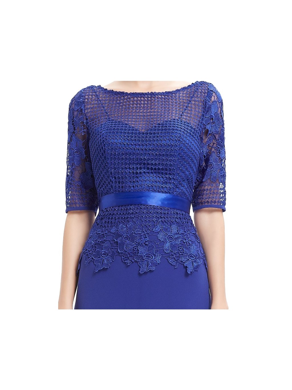 Krásné modré šaty. S krátkým rukávem, vršek je zdobený krajkou.