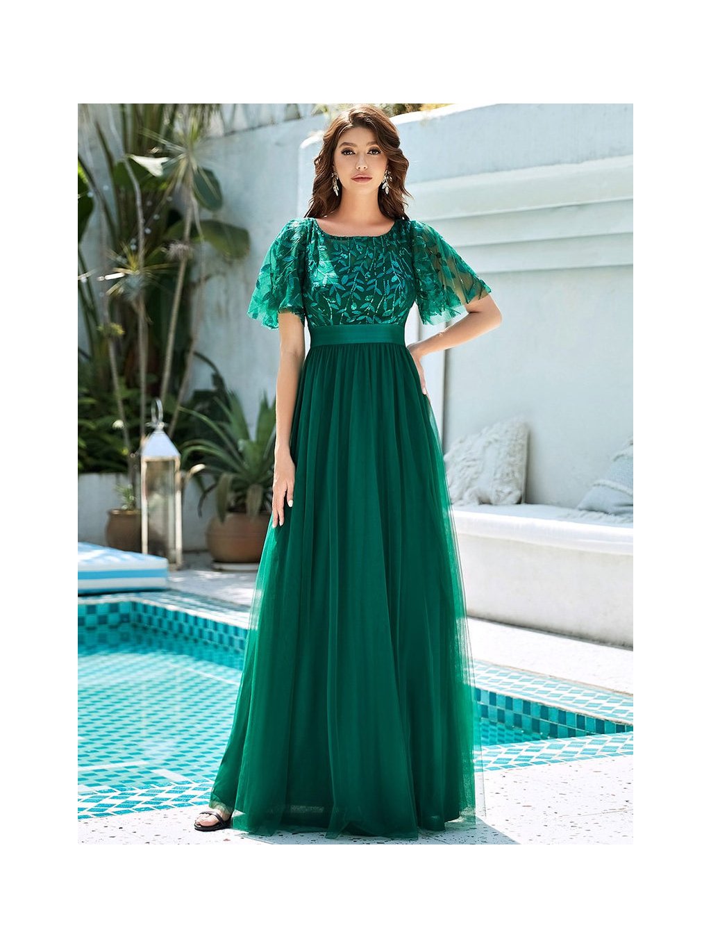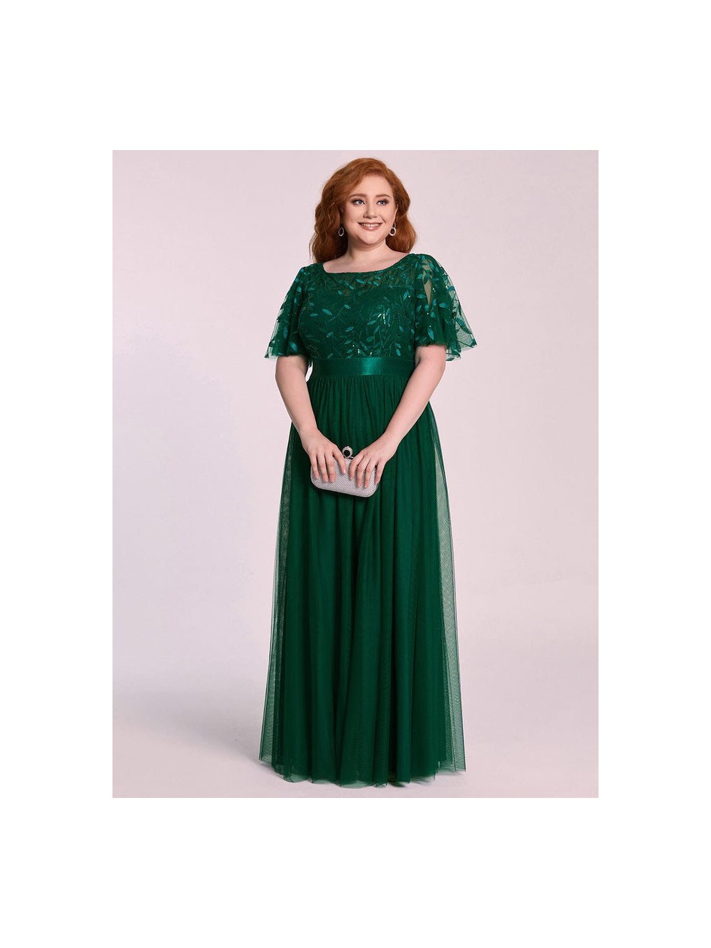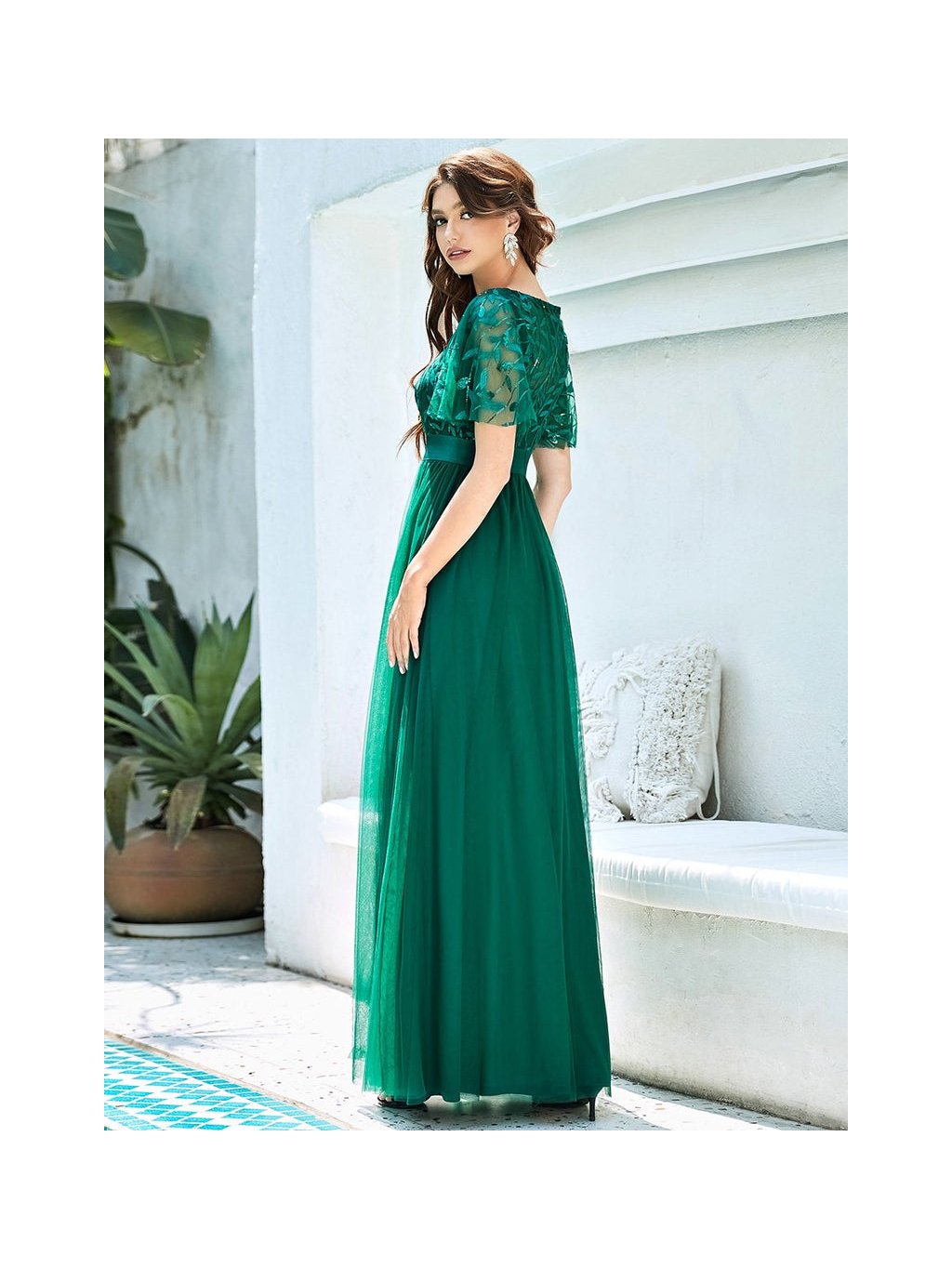 Šaty mají krátké volné rukávky. Na prsou i zádech je lodičkový výstřih. Vrchní díl je vyšívaný listy. Šatičky mají skrytý zip na zádech a nemají vycpávky.