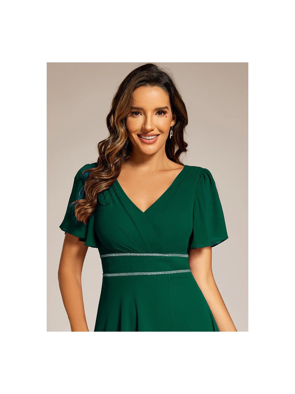 Šaty mají krátké volné rukávky. Na prsou i zádech je výstřih do V. V pase ozdoba stříbrných proužků. Šatičky mají skrytý zip na zádech a nemají vycpávky.