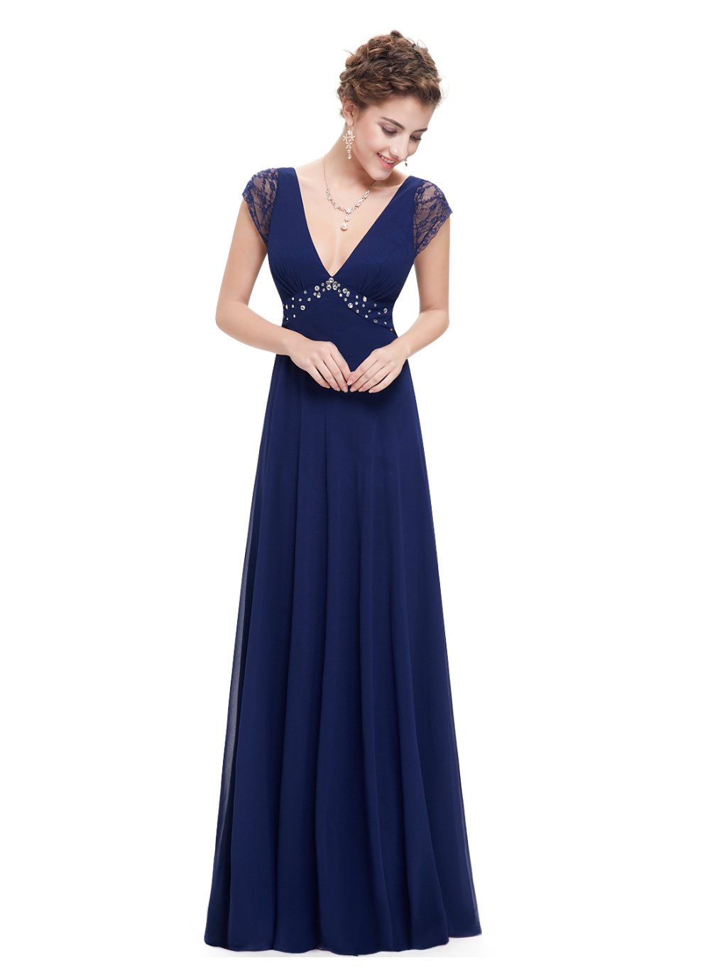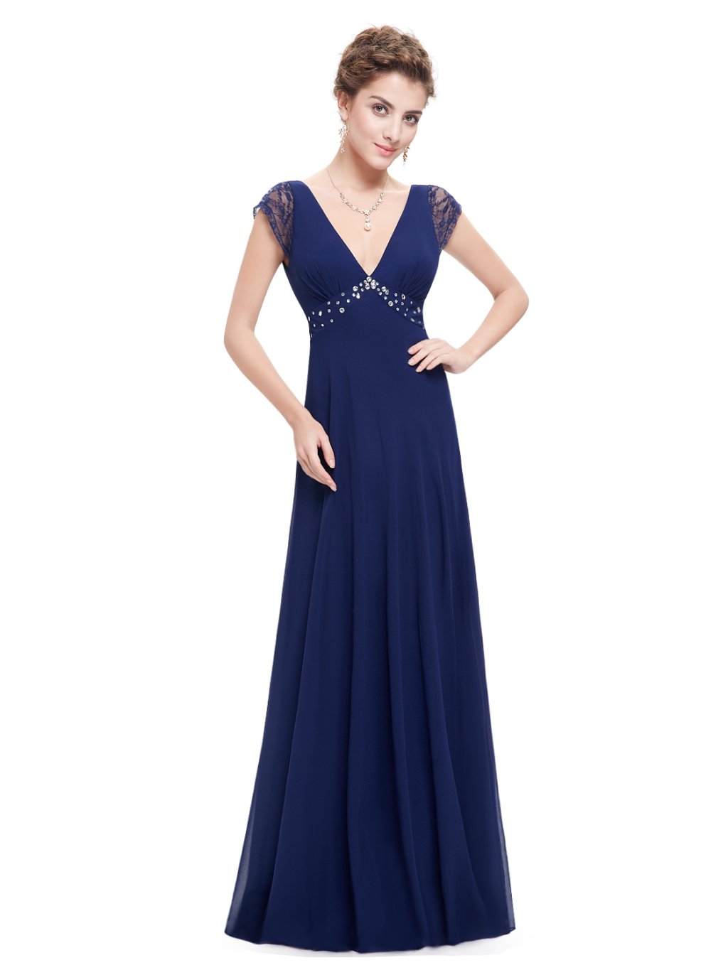 Večerní šaty elegantní, tmavě modré, zdobené kamínky, výstřih do V, krátké krajkové rukávky.