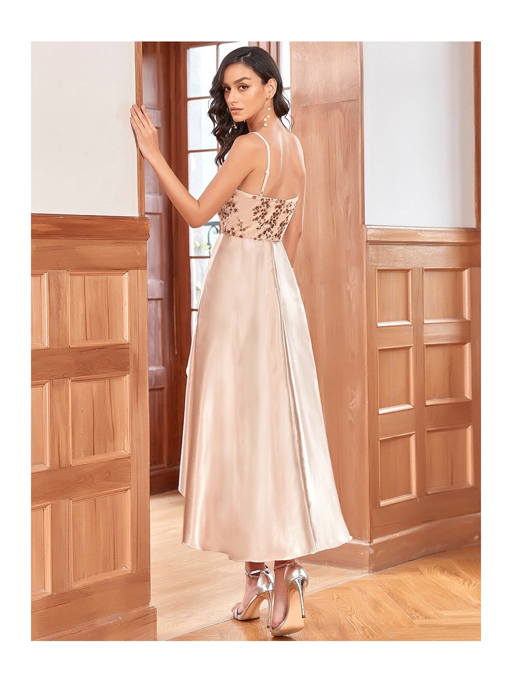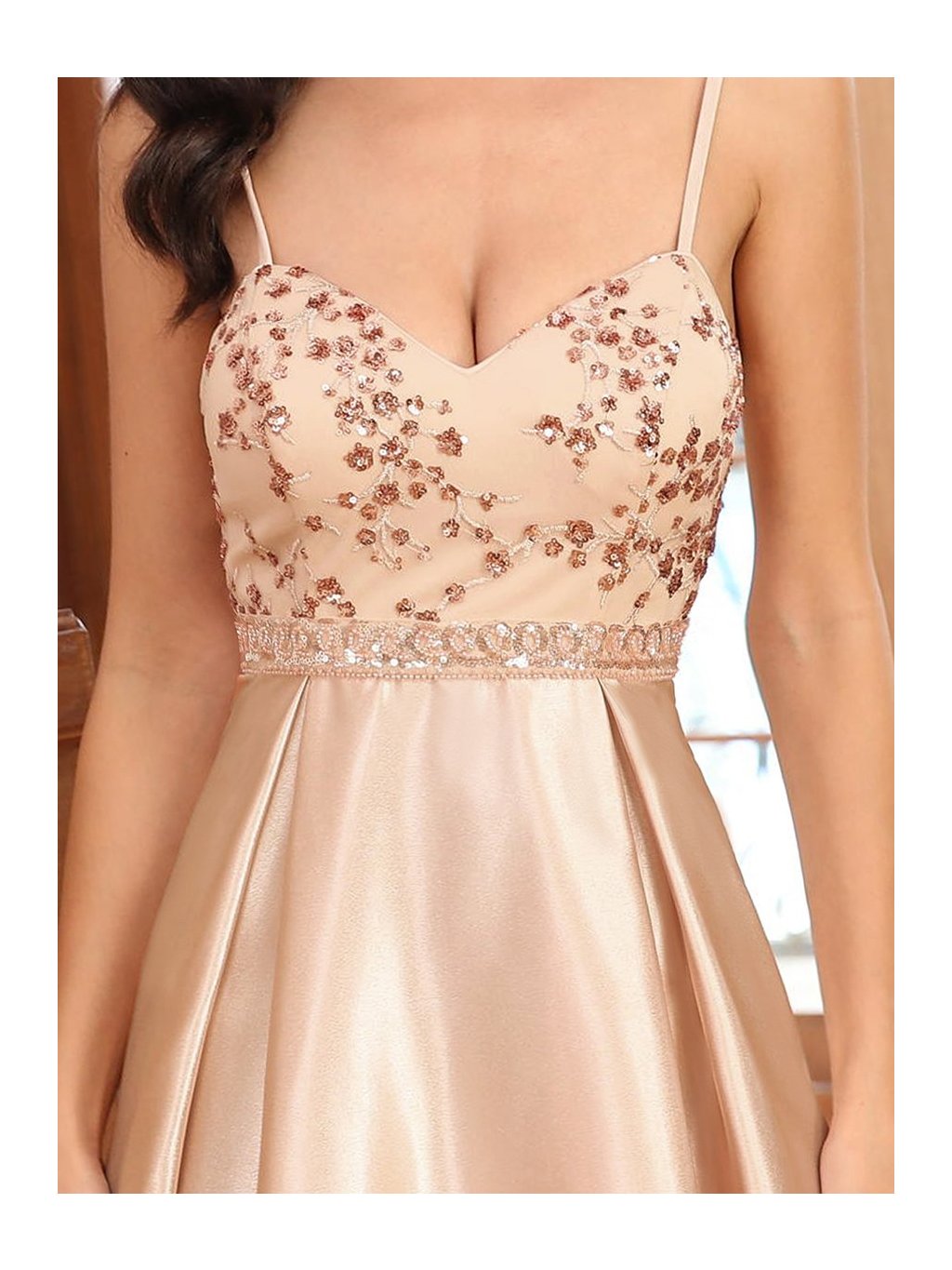 Asymetrické společenské šaty se zdobeným topem flitry a nitkami. Na špagetová ramínka se zapínám vzadu na zip. Šaty mají saténovou sukni.