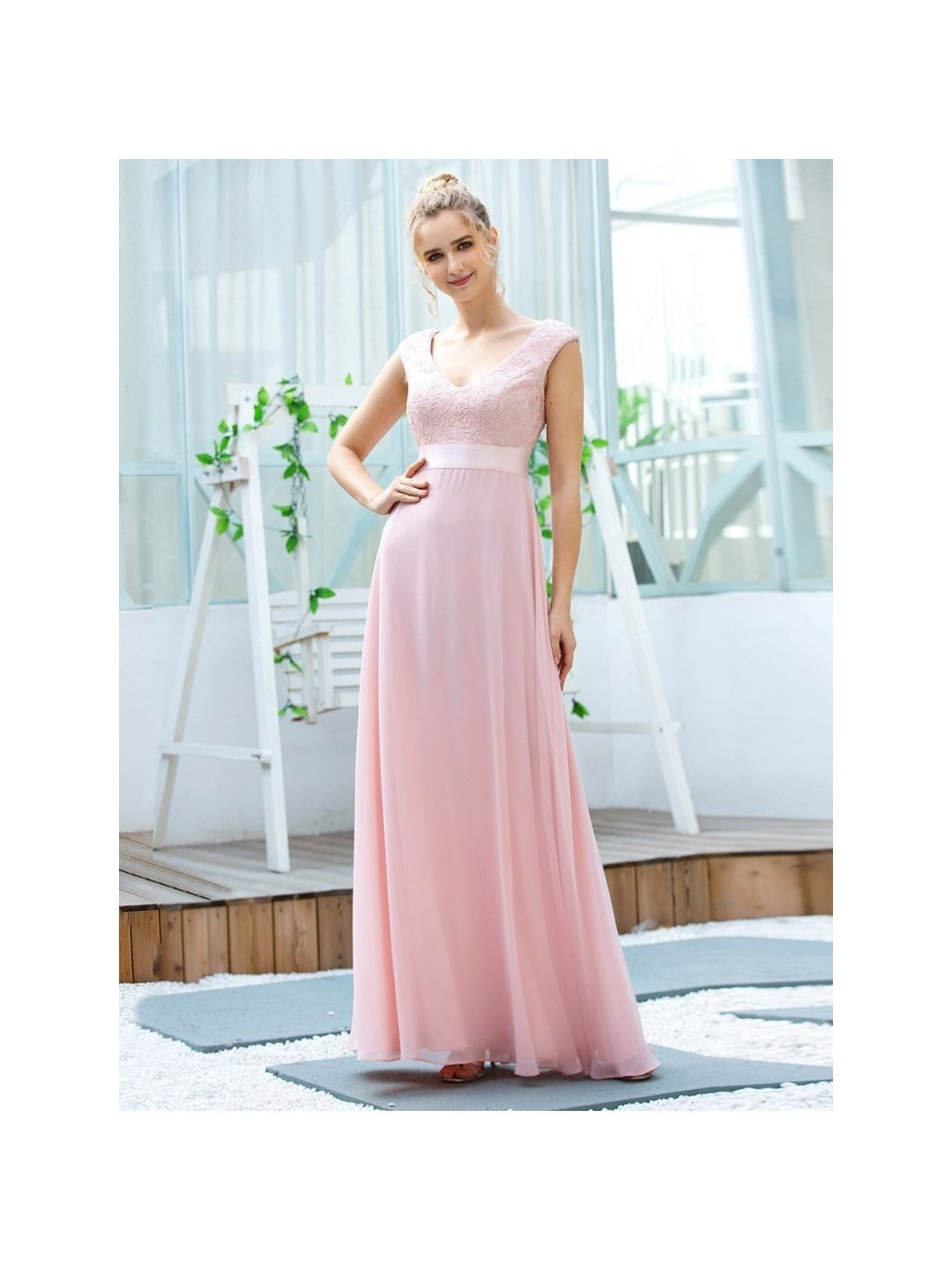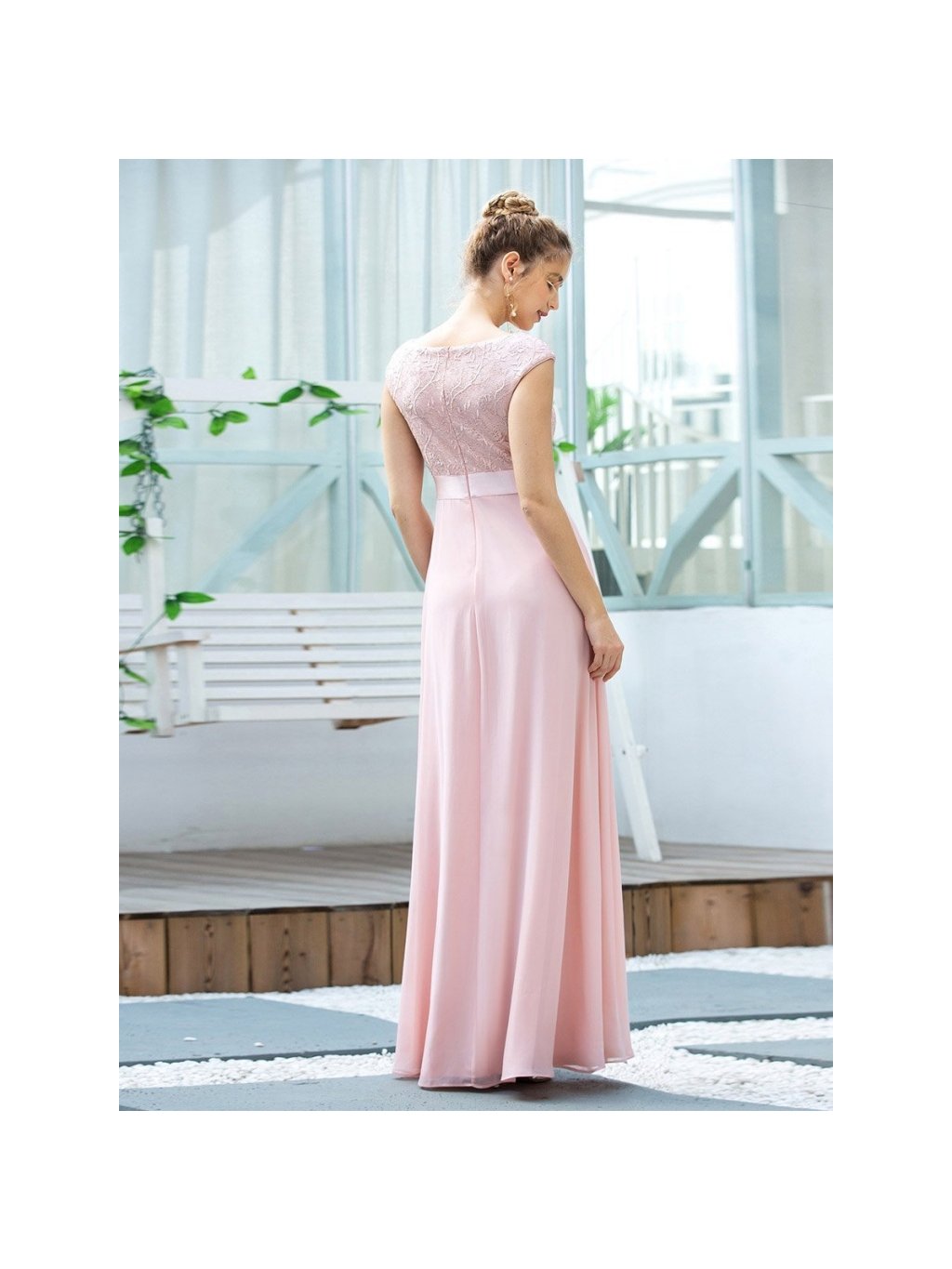 Luxusní krajkové jemně růžovů šaty Ever Pretty. Šaty mají hladkou sukni a krajkový vršek.. Na prsou mají véčkový výstřih, vzadu bez výstřihu. Na zádech mají skrytý zip. Nemají vložené vycpávky.