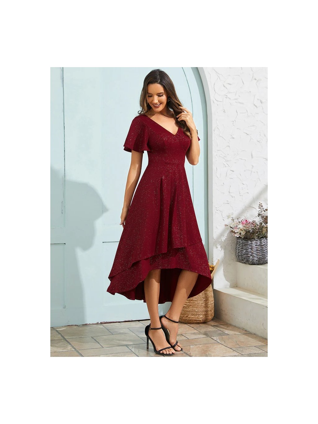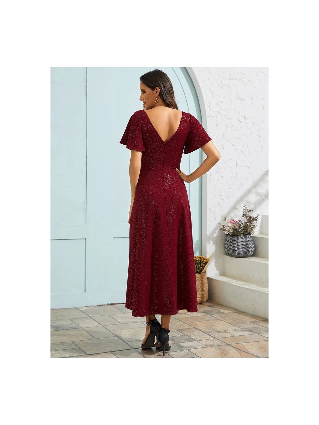 Jemné saténové flitrové šaty s krátkými rukávy, dokonalý jednoduchý design.  Šaty mají midi délku a asymetrickou sukni, ideální pro svatební hosty či družičky.