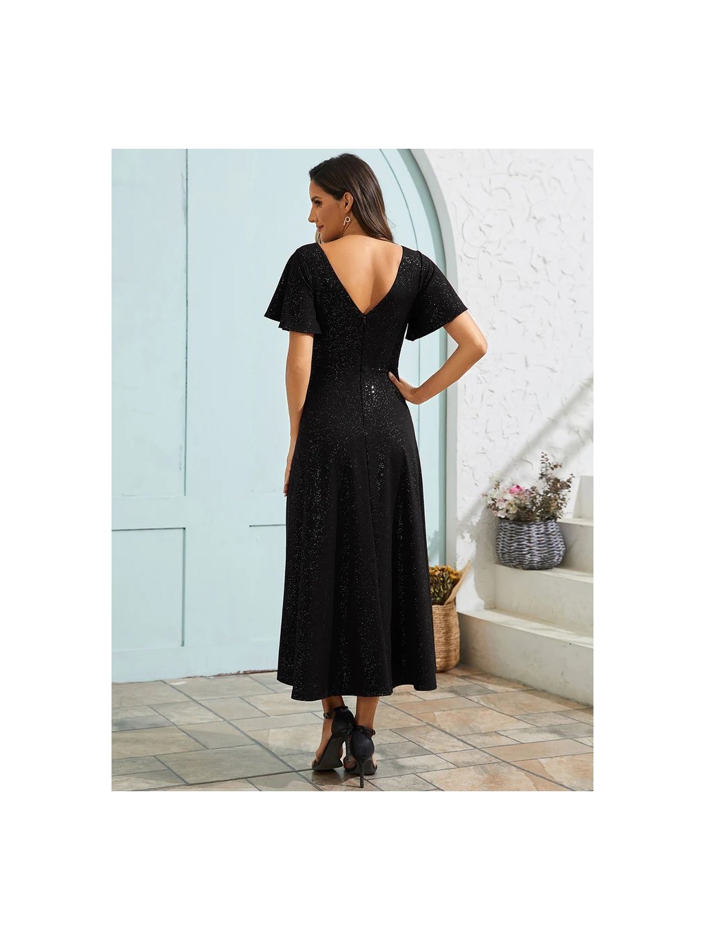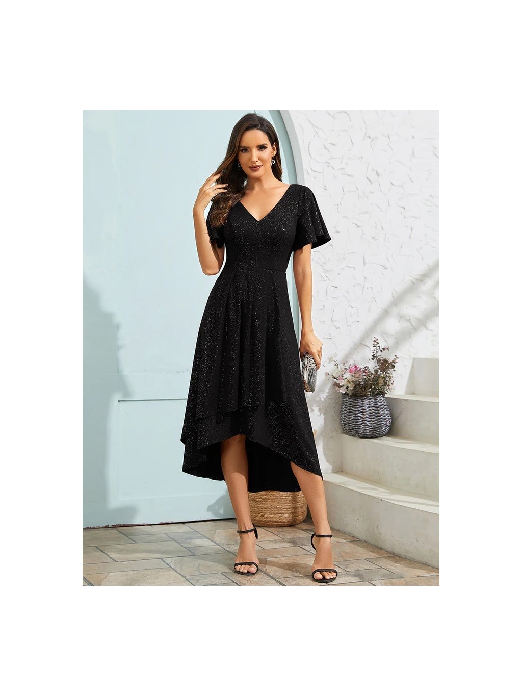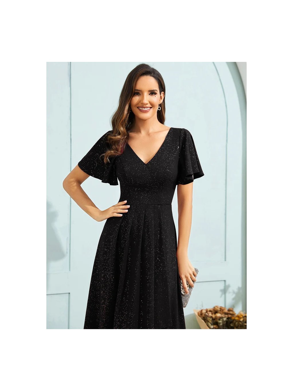 Jemné saténové flitrové šaty s krátkými rukávy, dokonalý jednoduchý design. Šaty mají midi délku a asymetrickou sukni, ideální pro svatební hosty či družičky.