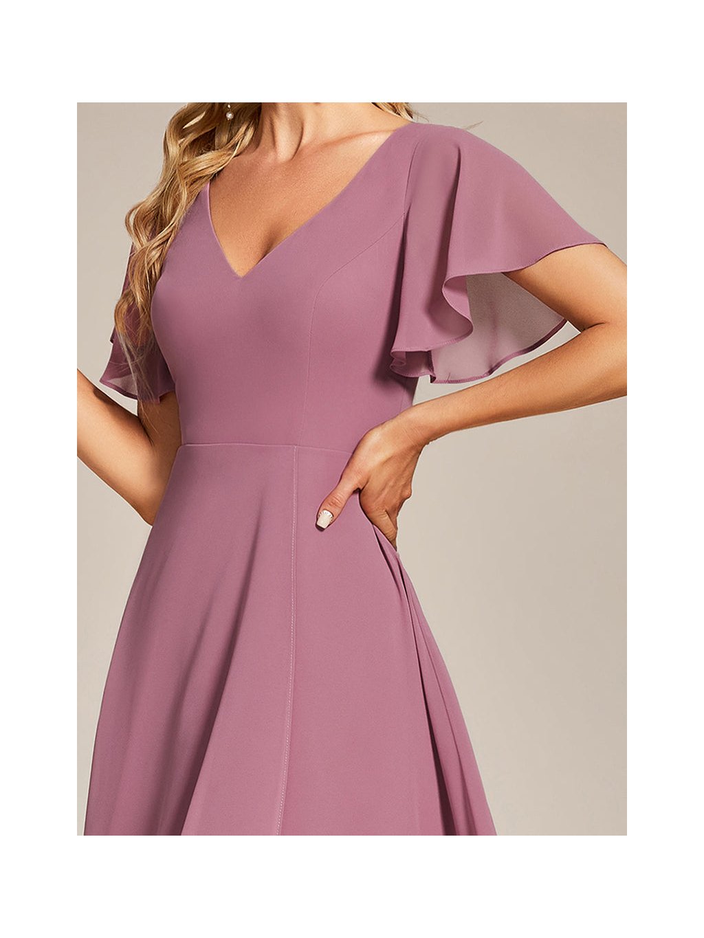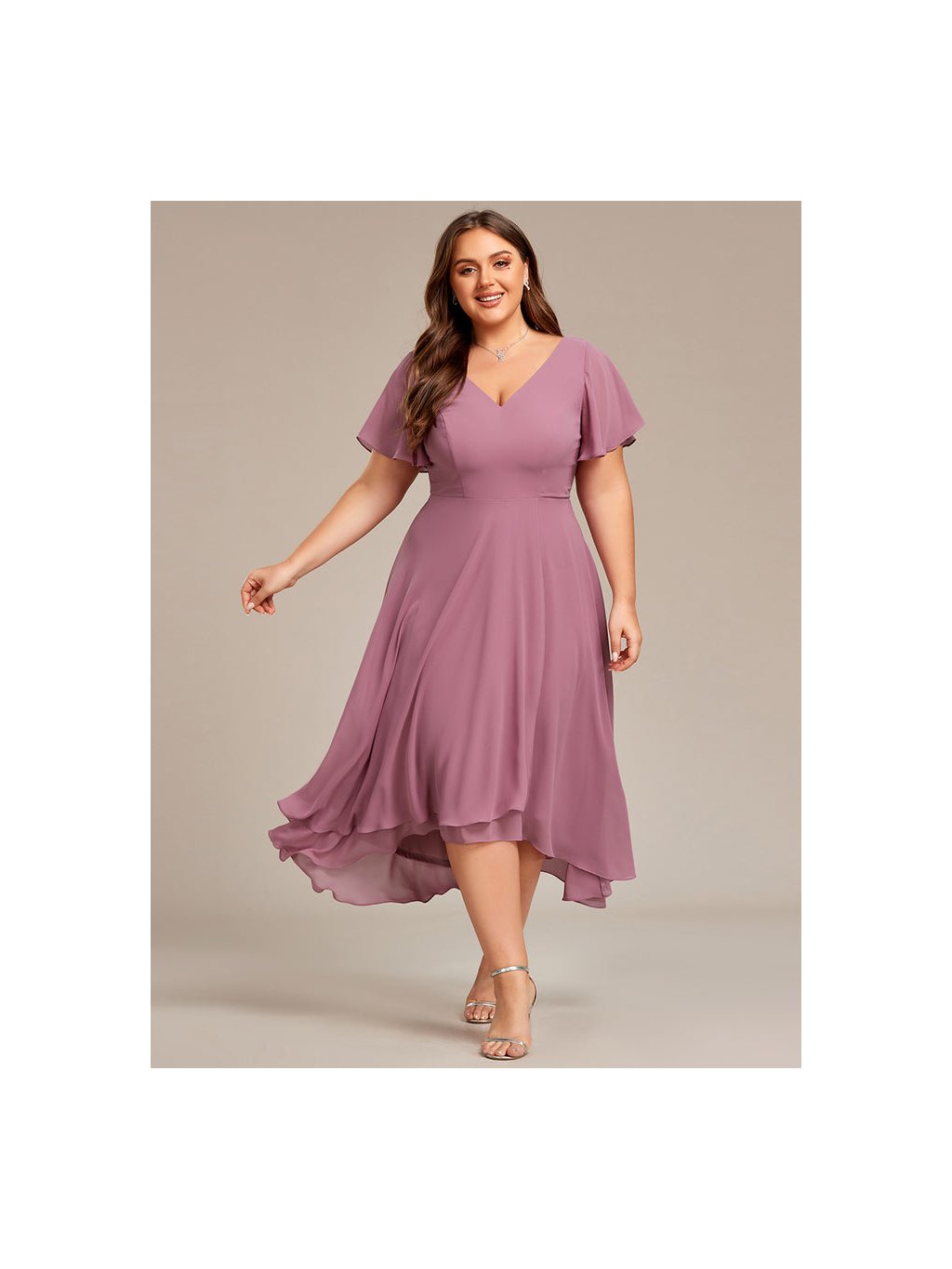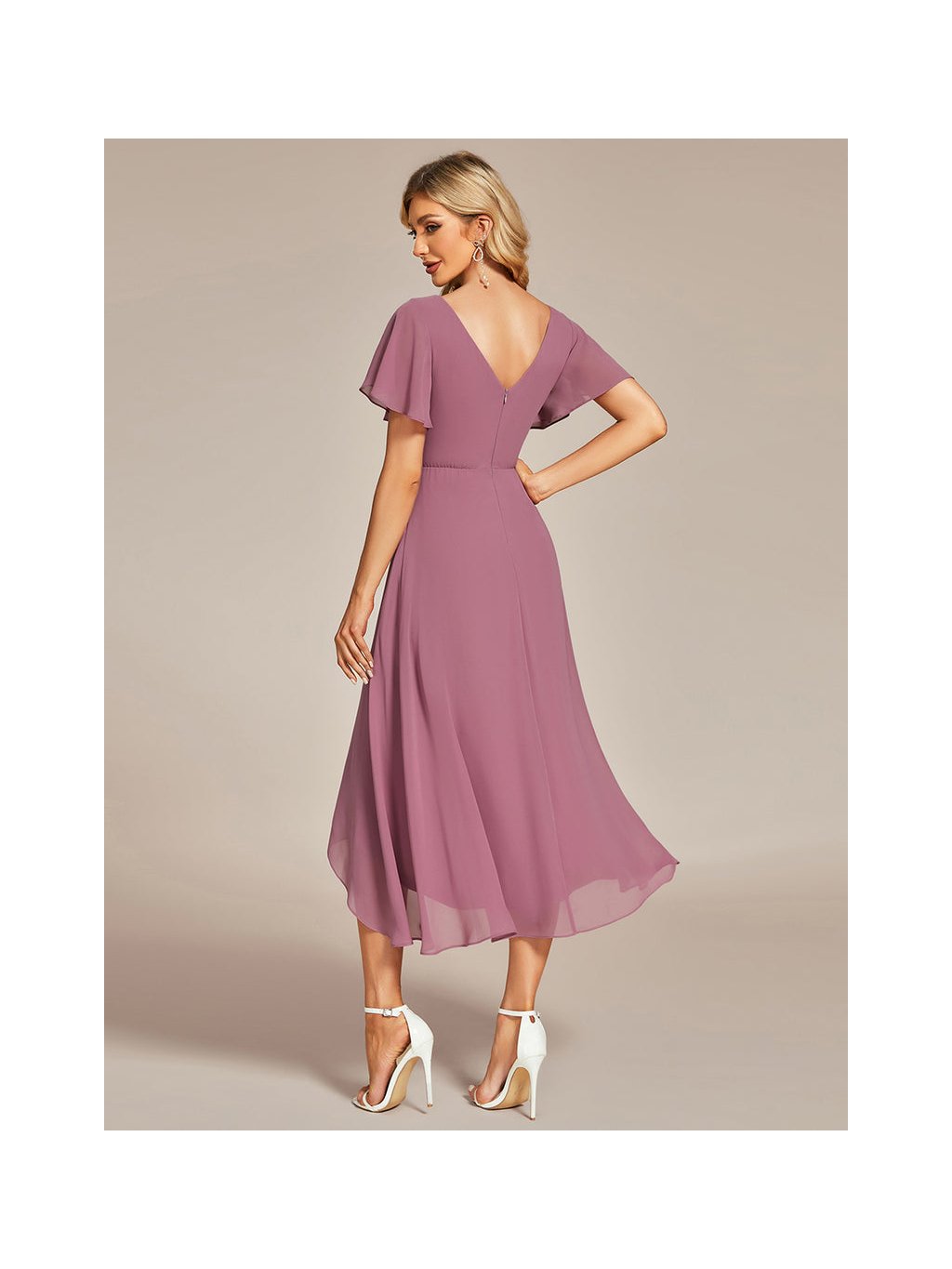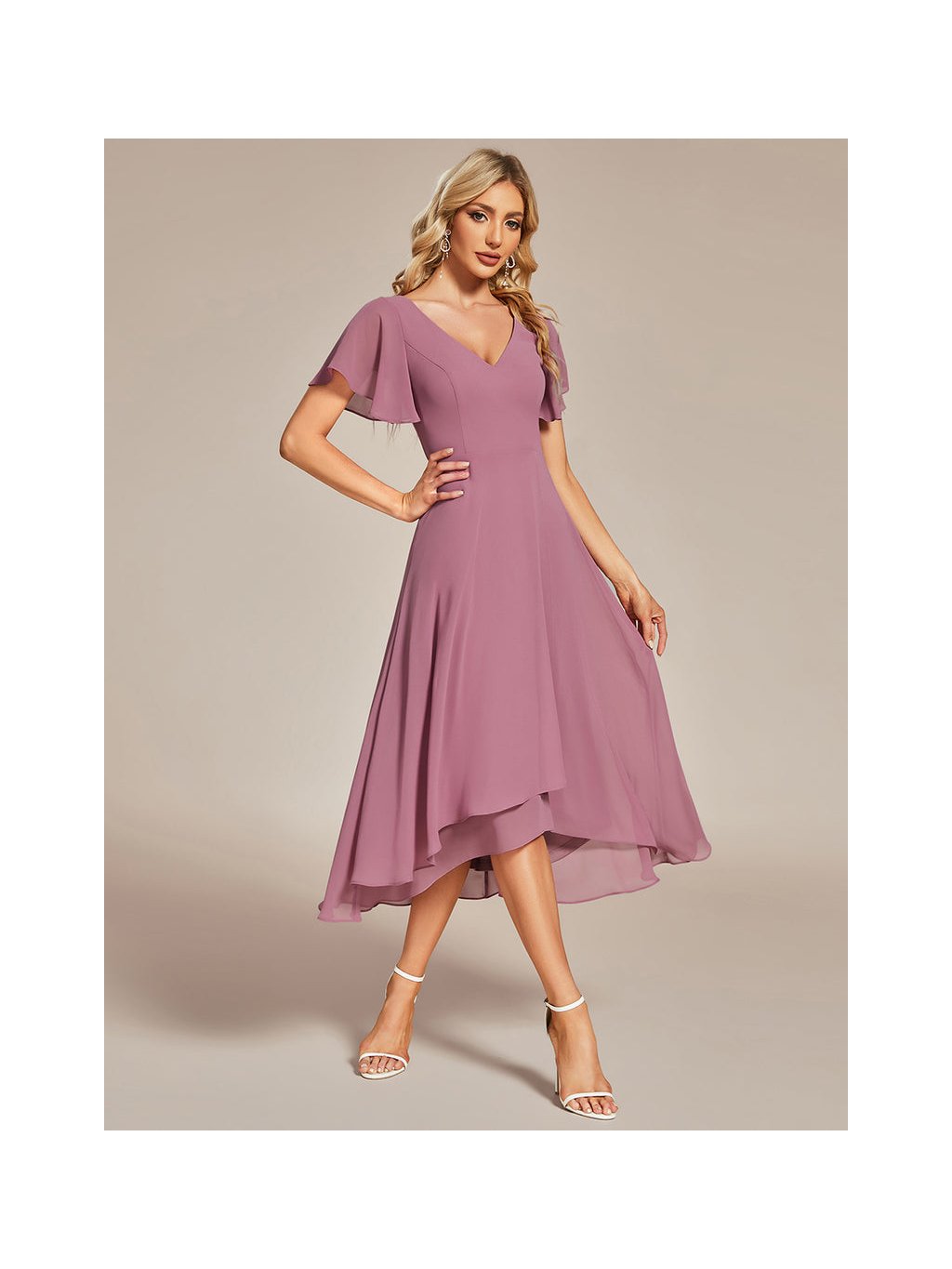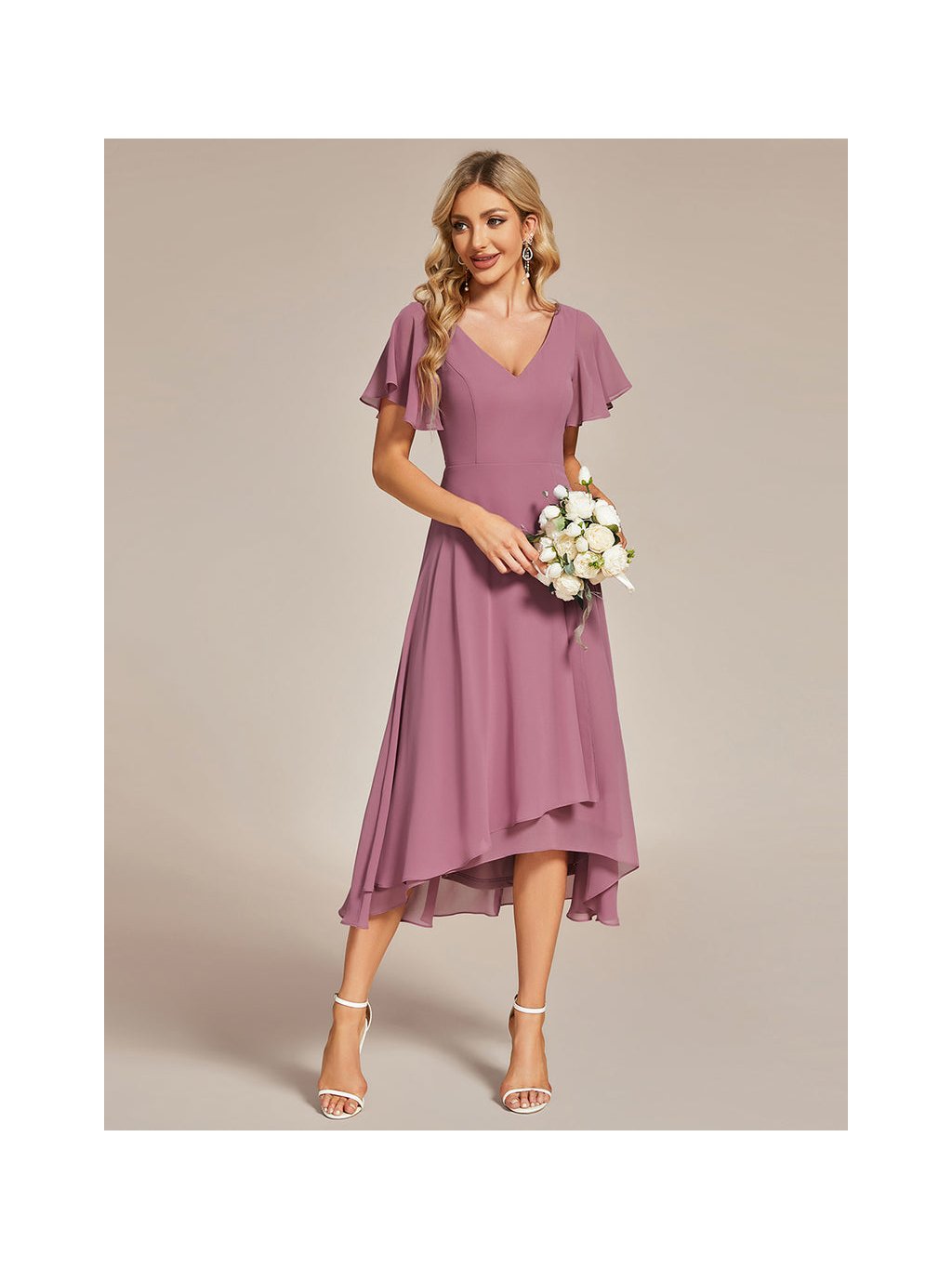 Jemné šifonové šaty s krátkými rukávy, dokonalý jednoduchý design. Šaty mají midi délku a asymetrickou sukni, ideální pro svatební hosty či družičky.