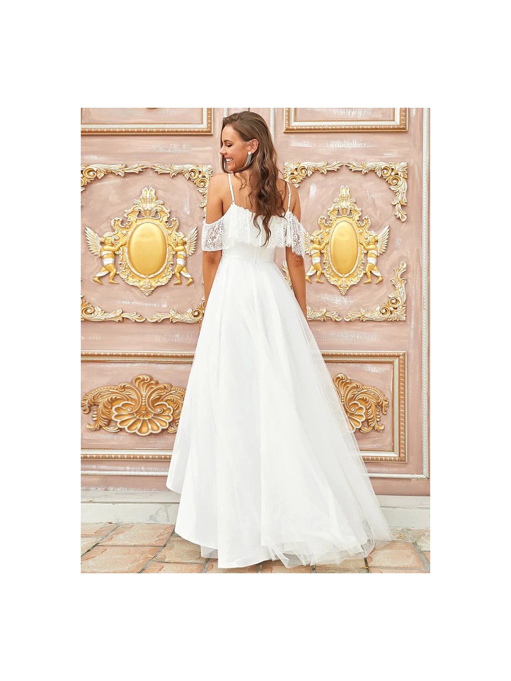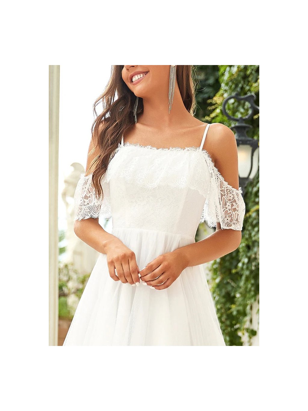 Jemné elegantní šaty Ever Pretty s krajkovým volánem a holými rameny. Šaty mají asymetrickou sukni. Šaty vhodné pro dívky a ženy s menším obvodem přes prsa.