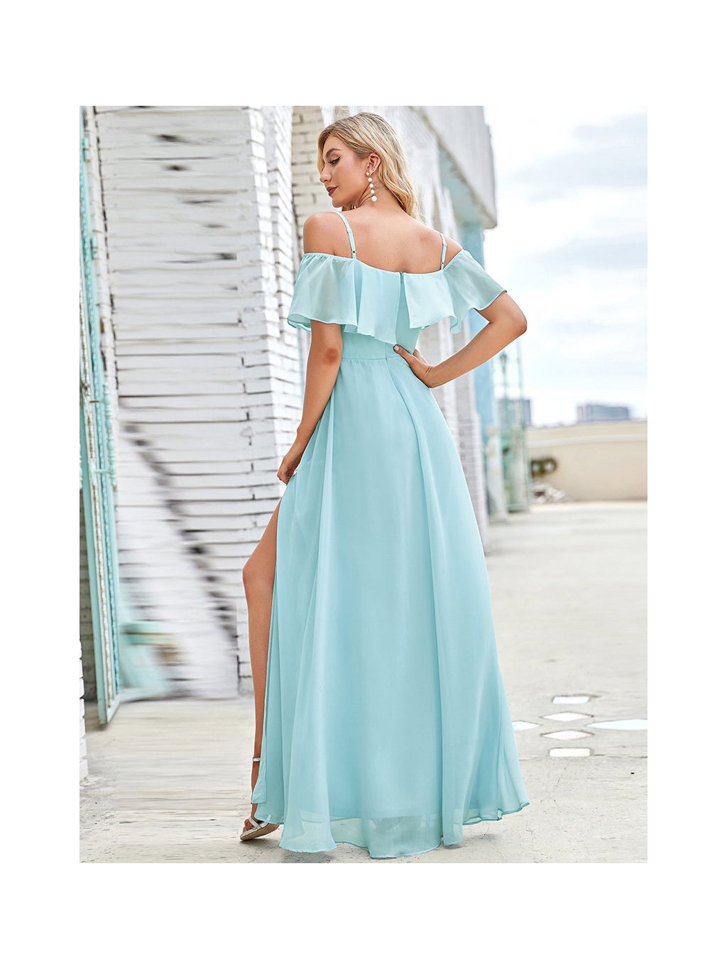 Jemné elegantní šaty Ever Pretty s volánem a holými rameny se špagetovými ramínky. Šaty mají nenápadný rozparek. Vzadu zapínání na zip.