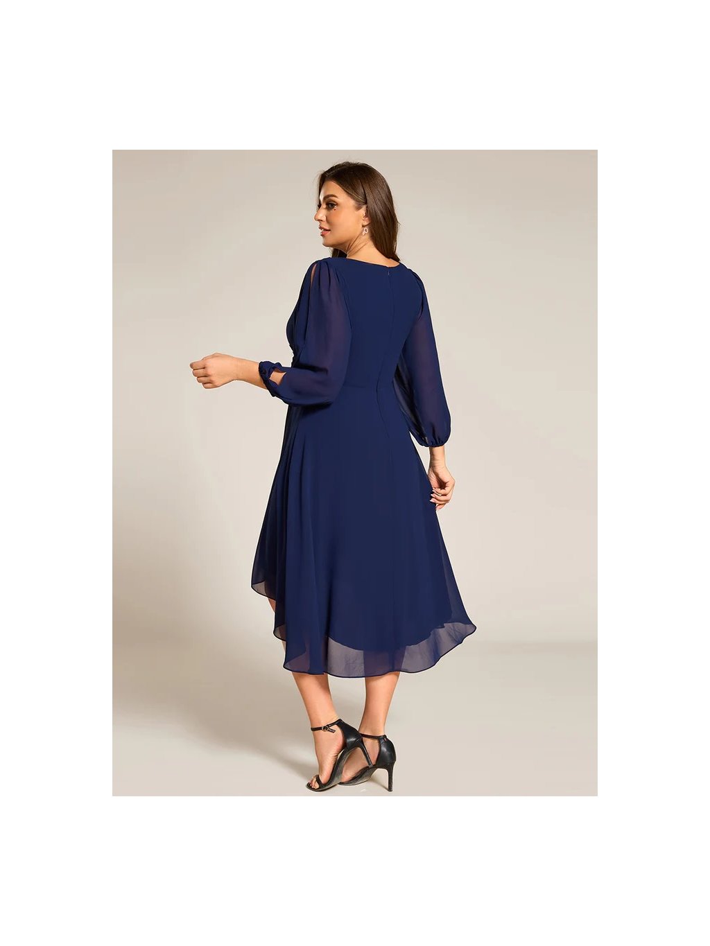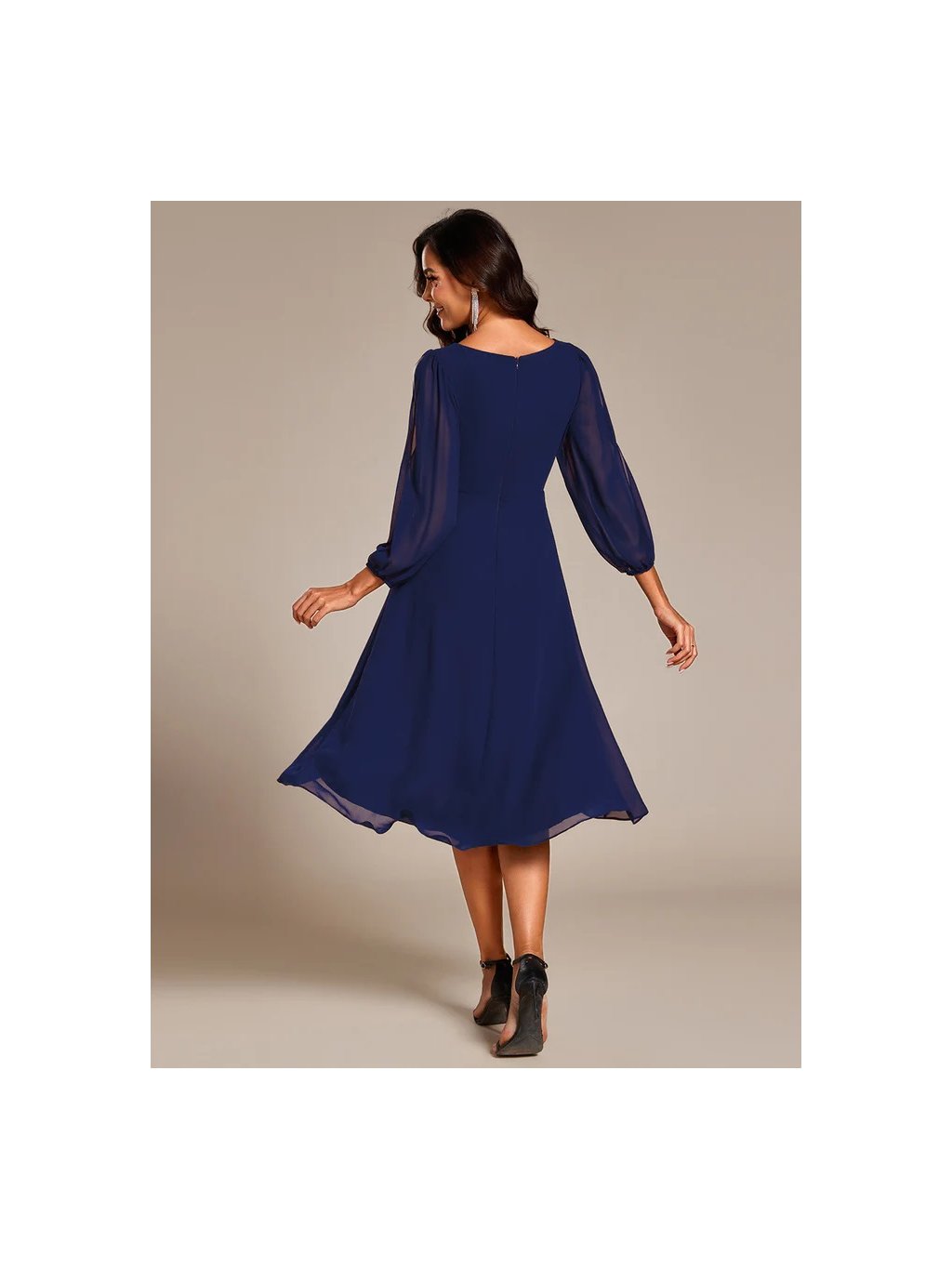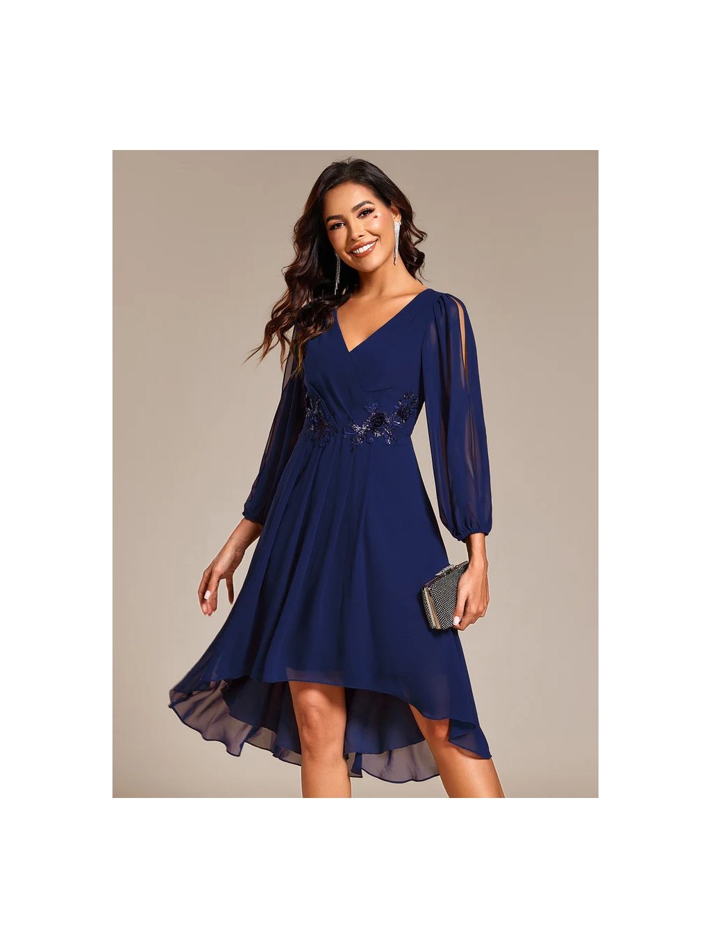 Společenské plesové modré krátké šaty, dlouhý rukáv, véčkový výstřih. I ve větších velikostech.