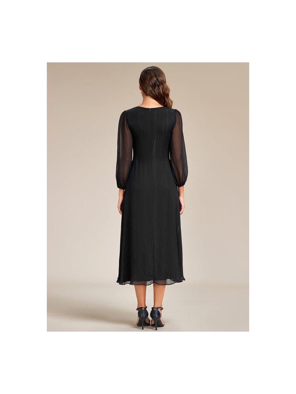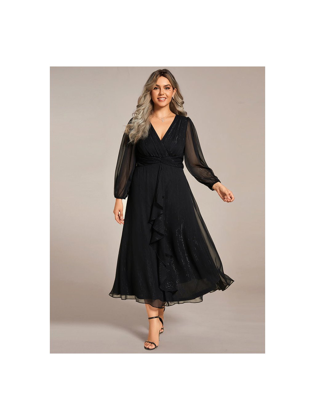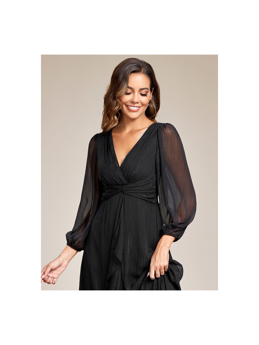 Šaty černé střední délky s dlouhými rukávy. V pase mají mírné řasení. Nemají vystužení prsou. Vzadu na zip. Černá šifonová látka prošitá jemnou stříbrnou nitkou.