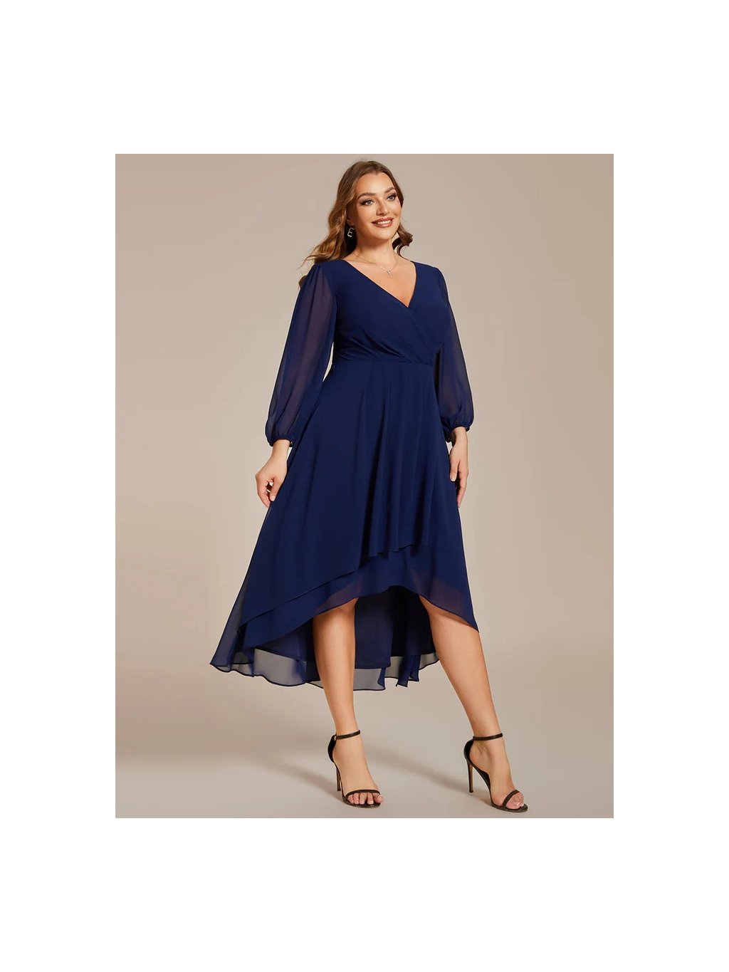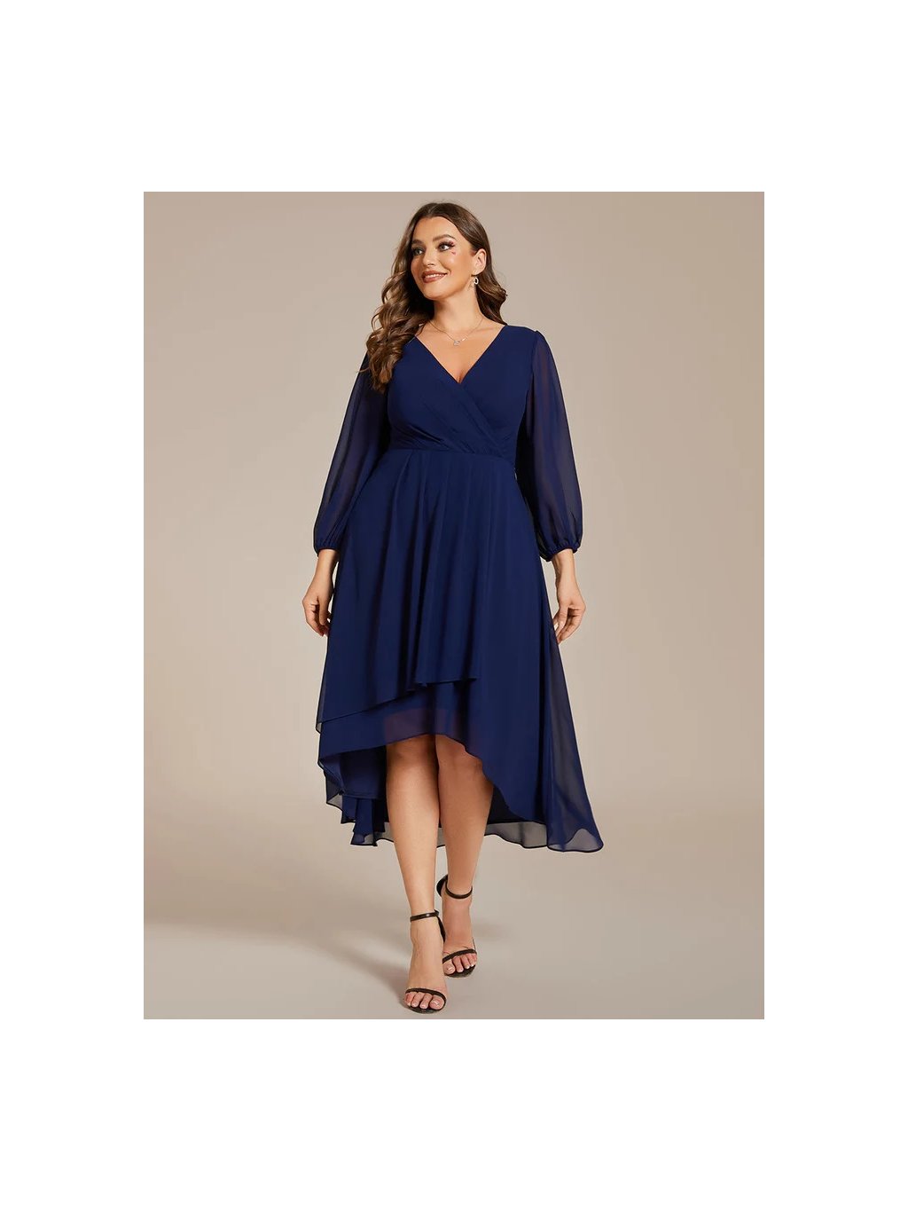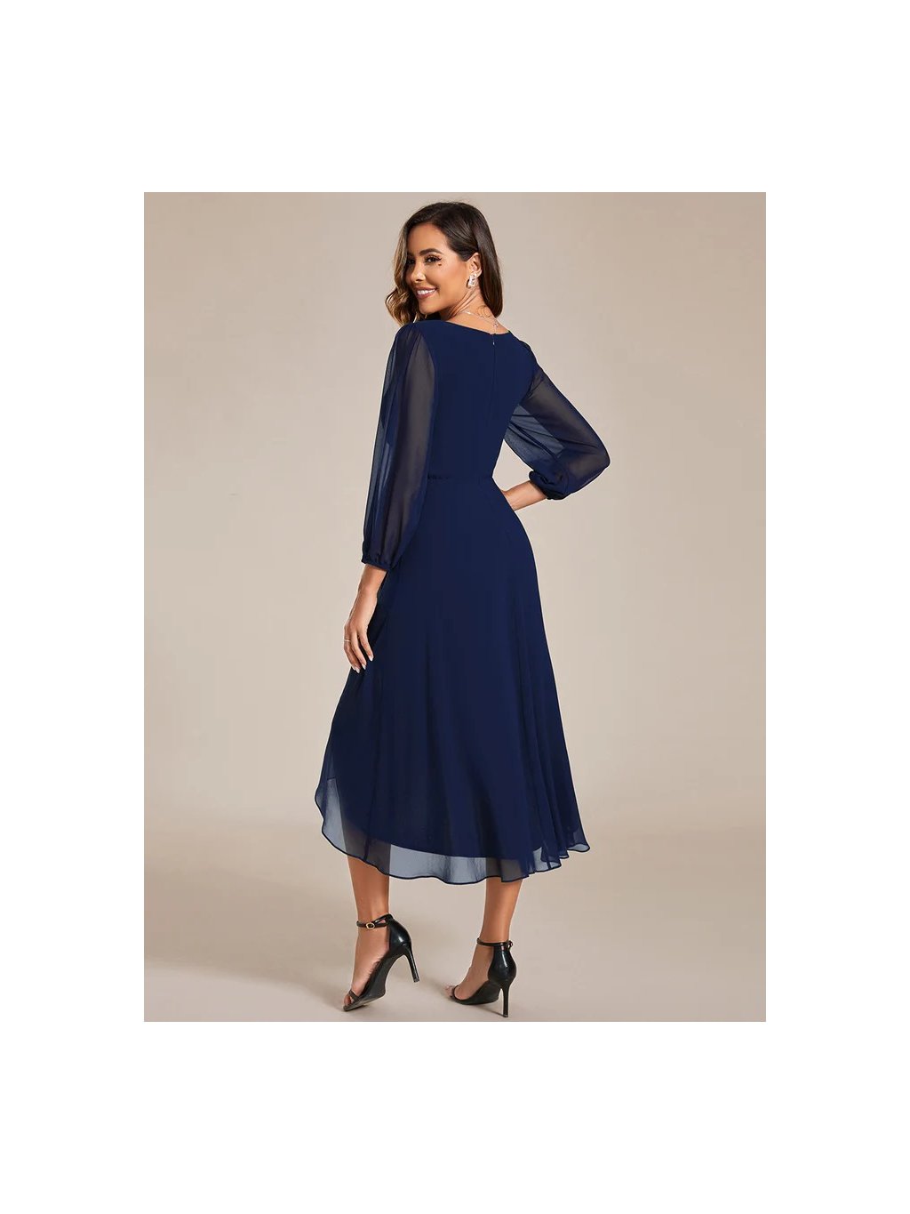 Elegantní tmavě modré šaty střední délky s dlouhými rukávy. V pase jsou skládané což jim dává zvláštní tvar.S výstřihem do V a v zadu zapínání až ke krku.