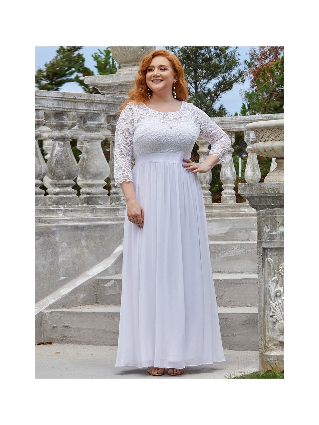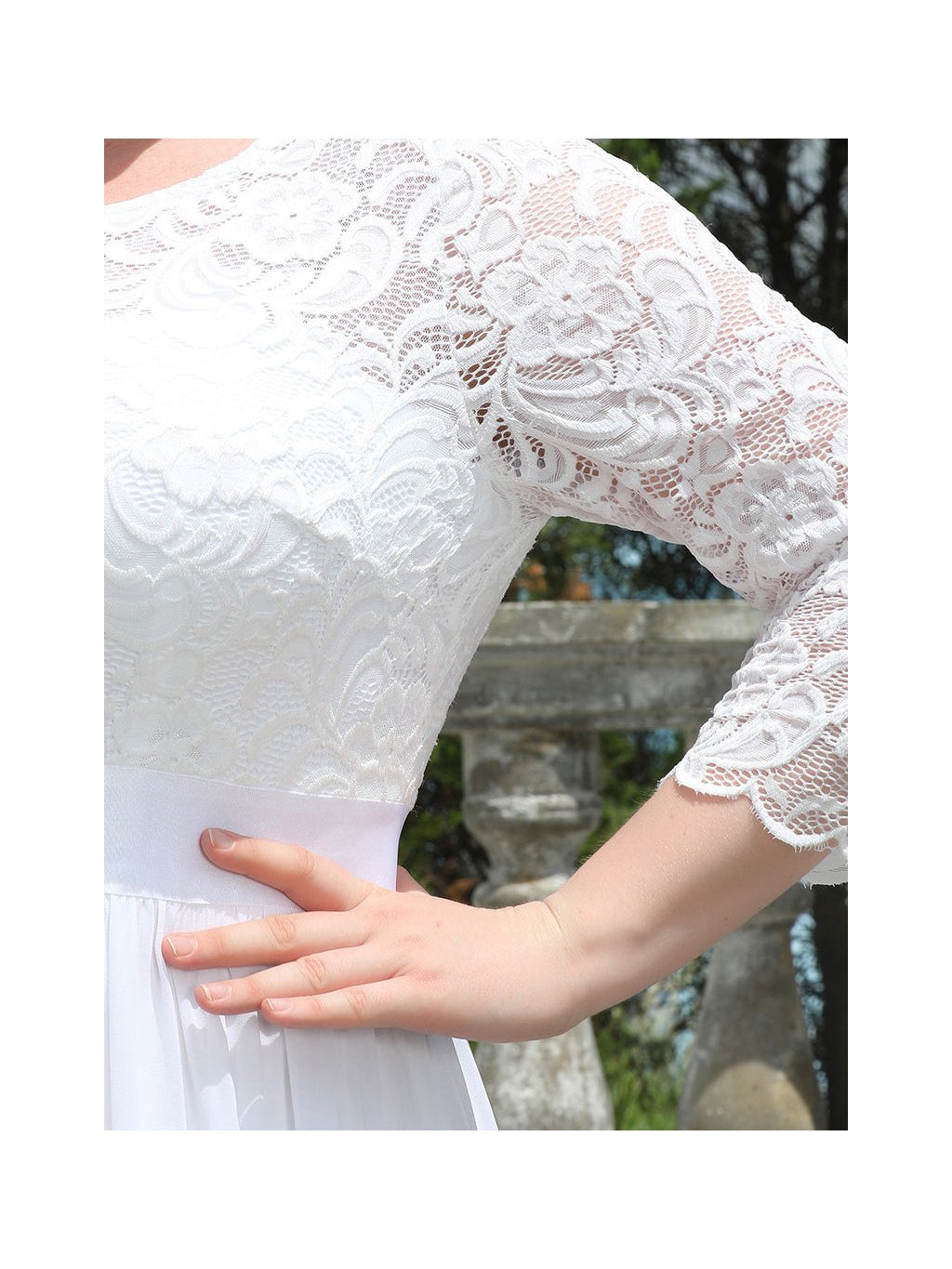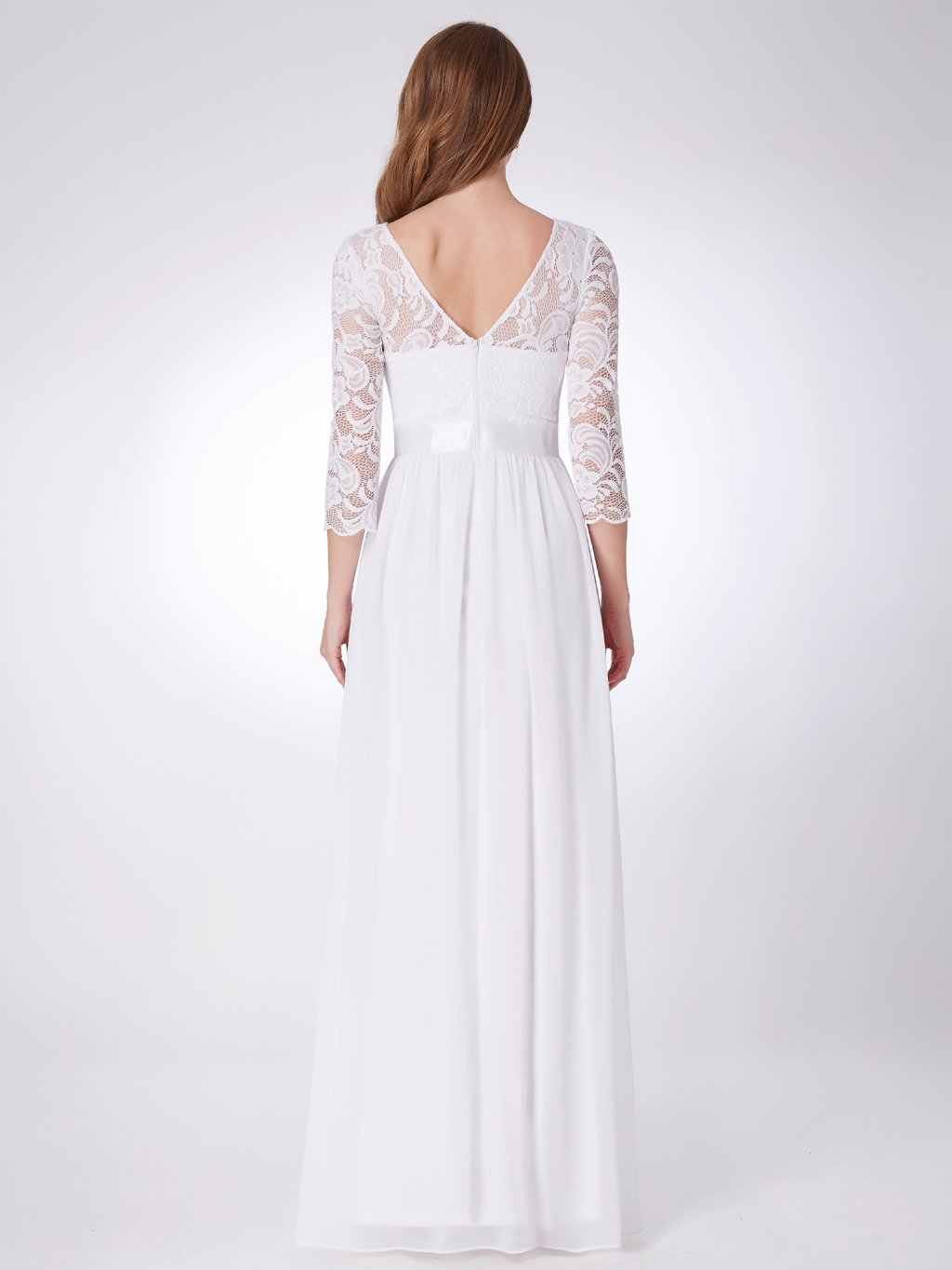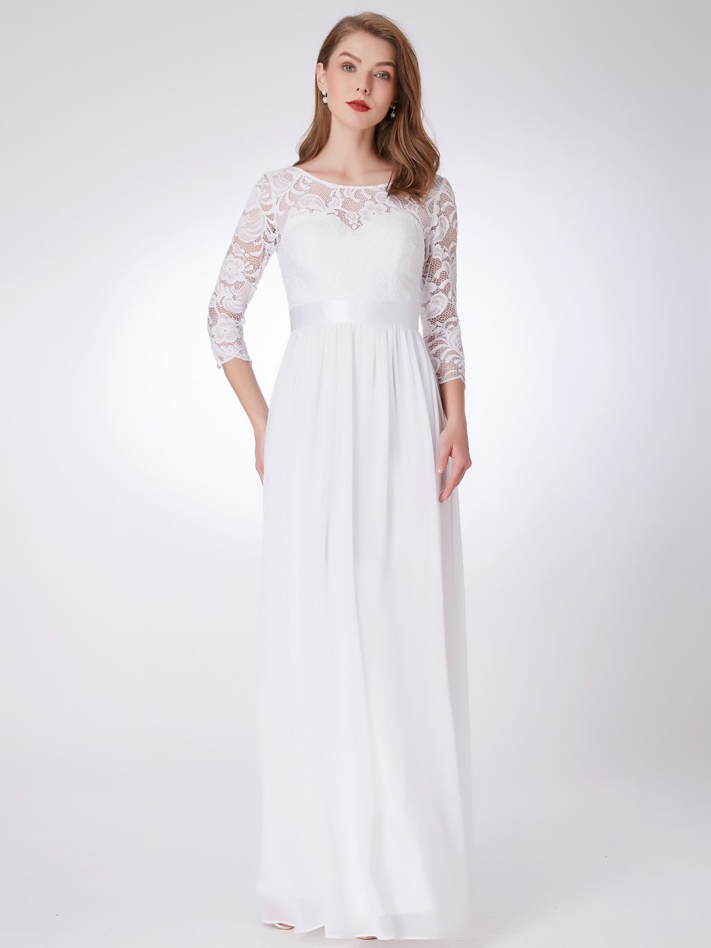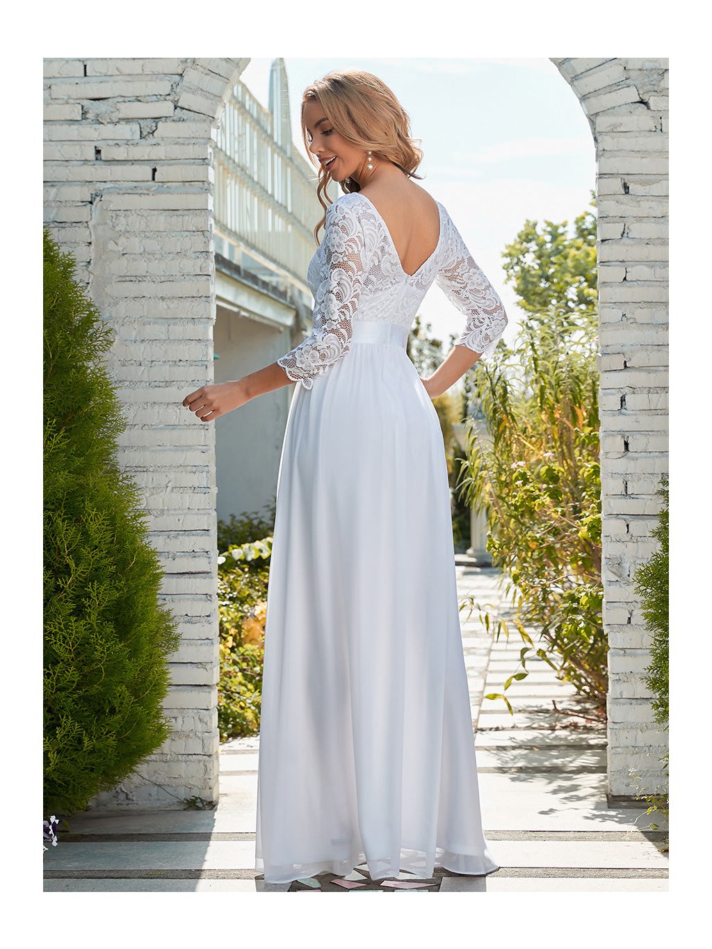 Luxusní krajkové svatební šaty Ever Pretty. Šaty mají hladkou sukni a krajkový vršek s dlouhým rukávem. Na prsou mají lodičkový výstřih a na zádech hluboký véčkový. Na zádech mají skrytý zip. Mají vložené vycpávky, lze vzít bez podprsenky.