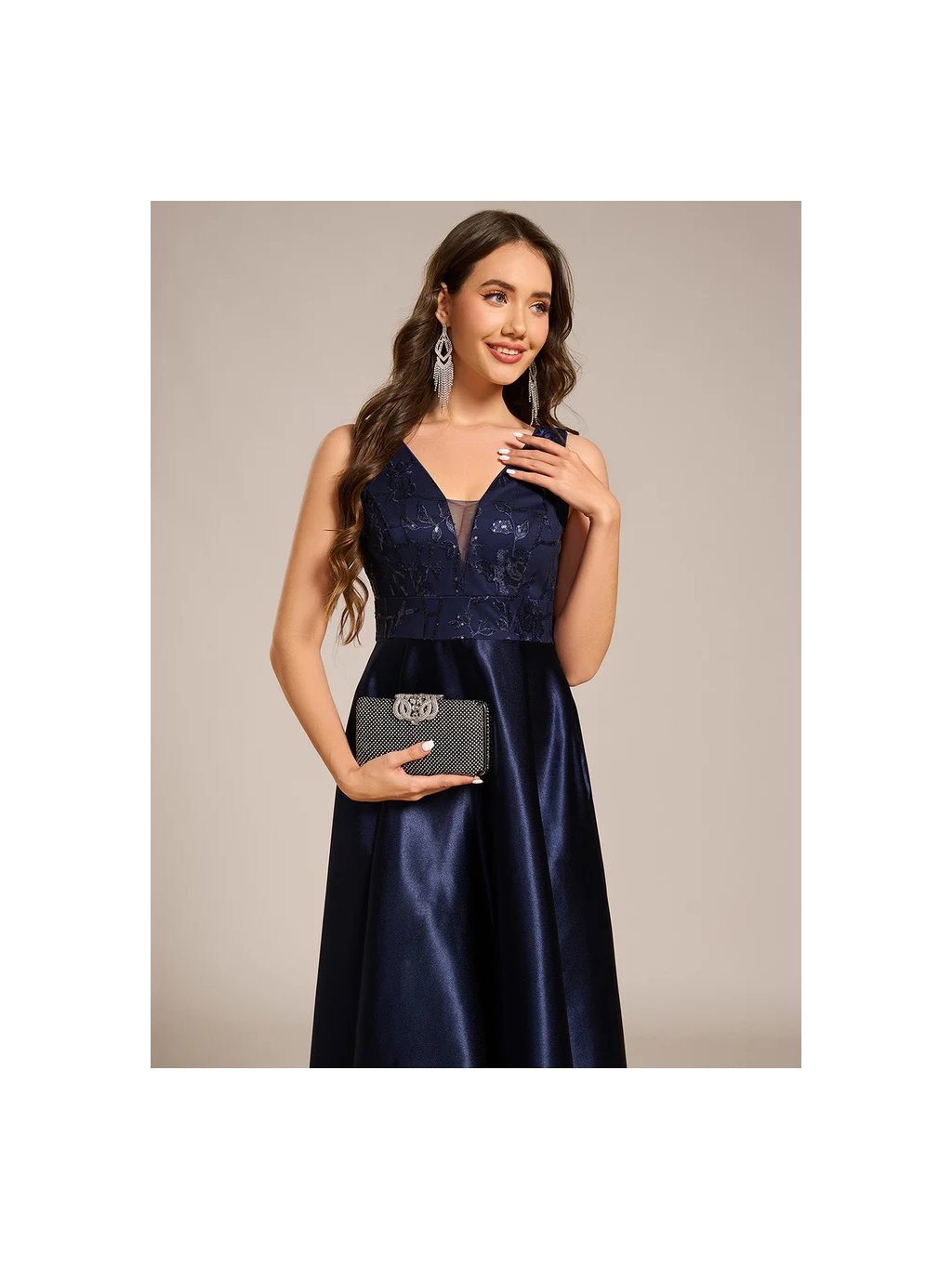 Luxusní tmavě modré šaty Ever Pretty. Šaty mají široká ramínka, na prsou i zádech mají velký výstřih. Vrchní díl je zdobený výšivkou. Sukně je bohatá, saténová s kapsami