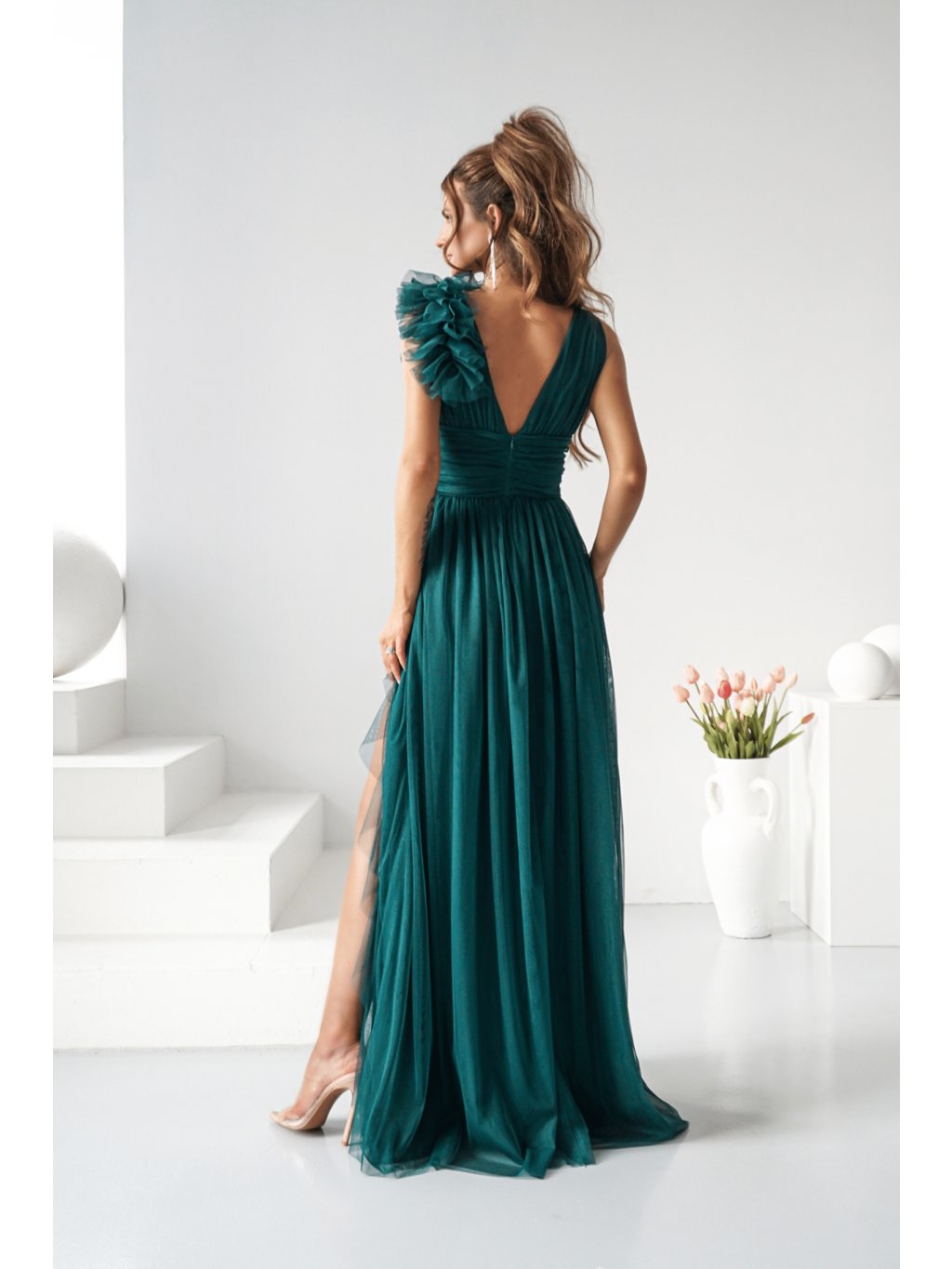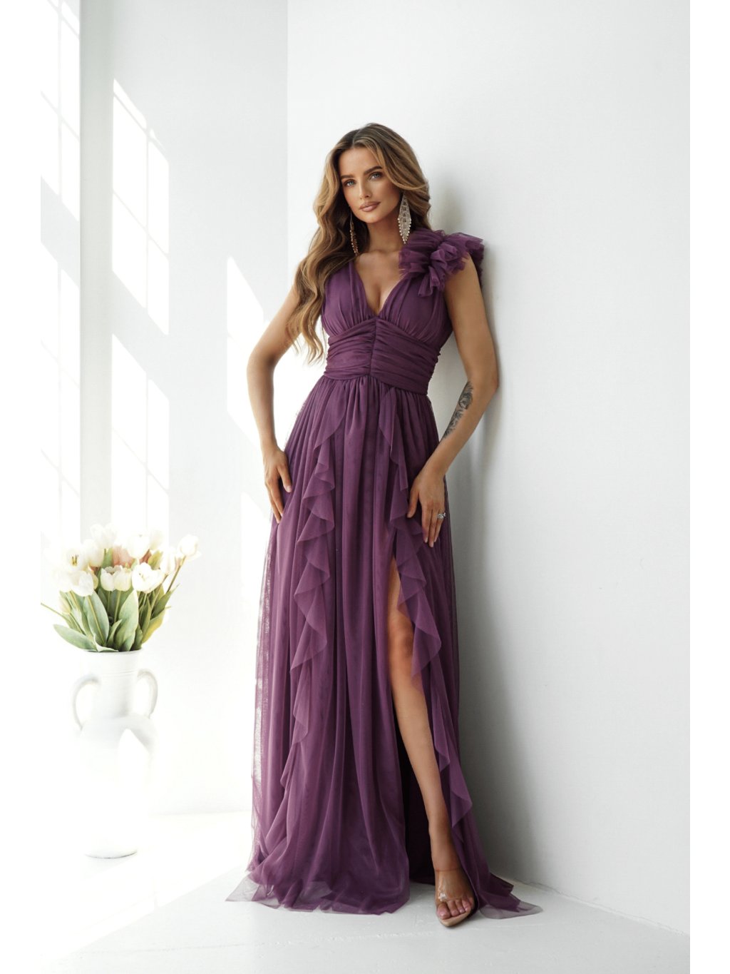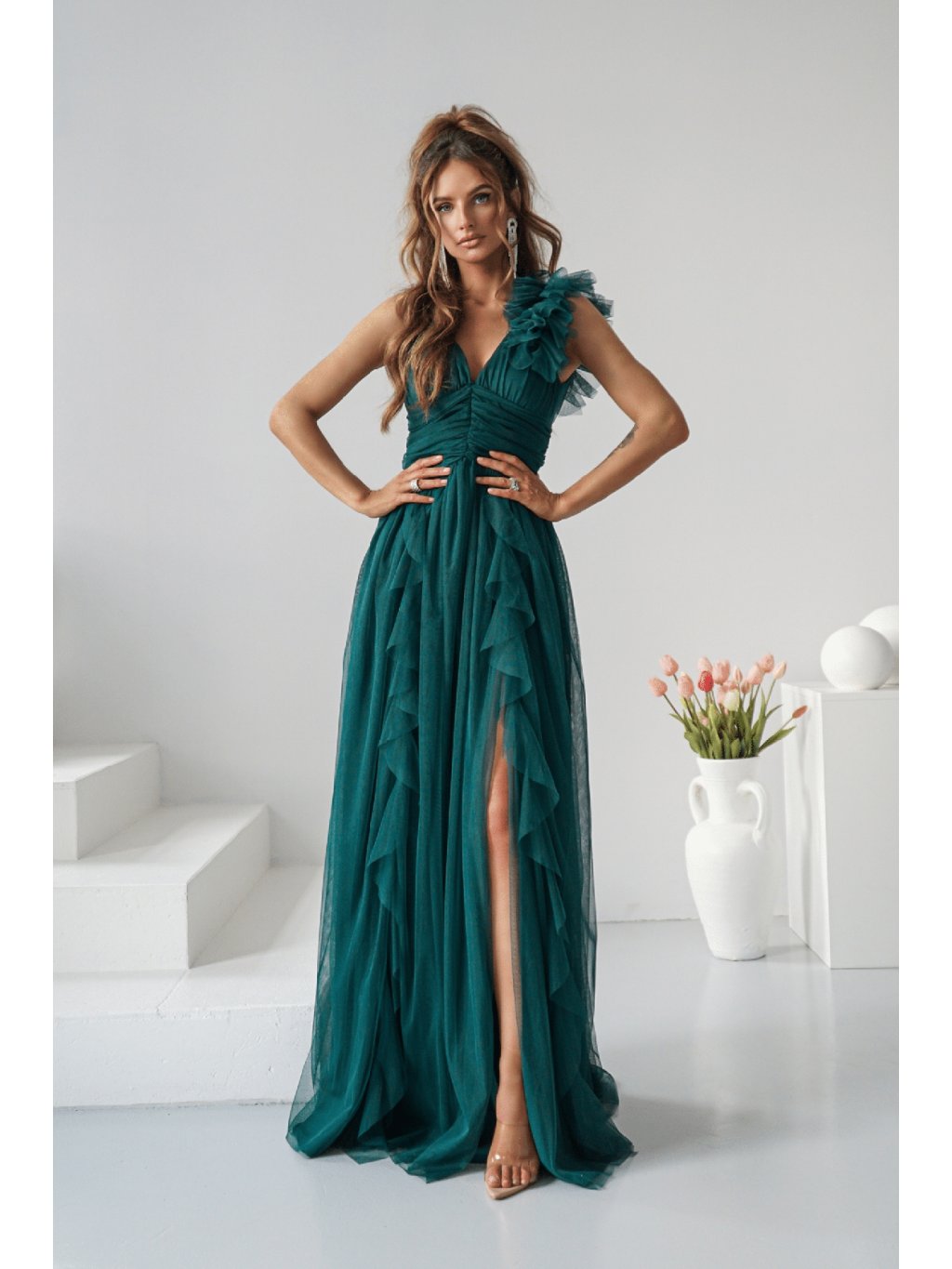 Luxusní šaty z tylového materiálu, který je velmi elegantní a nepřhlédnutelný. Budete doslova zářit. Šaty jsou s rozparkem a volány.