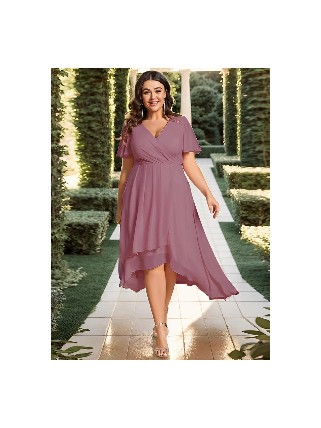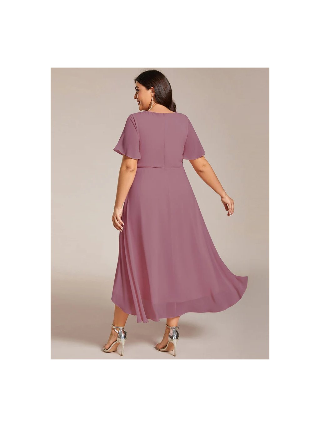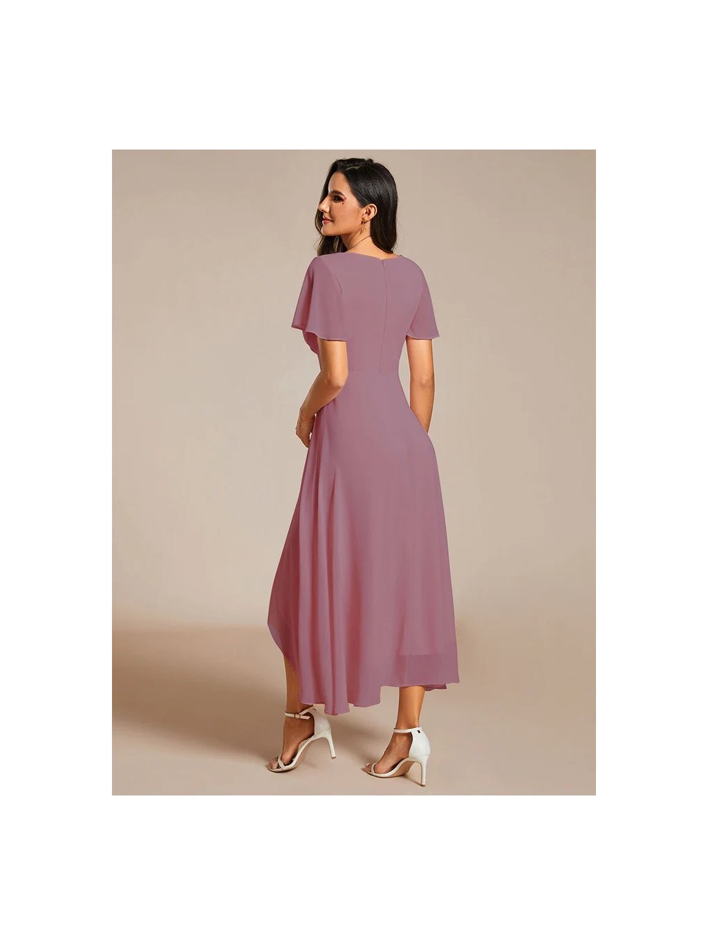 Jemné šifonové šaty s volánovým rukávem,výstřihem do V dokonalý jednoduchý design. Šaty mají midi délku a asymetrickou sukni, ideální pro nevěstu po obřadu.