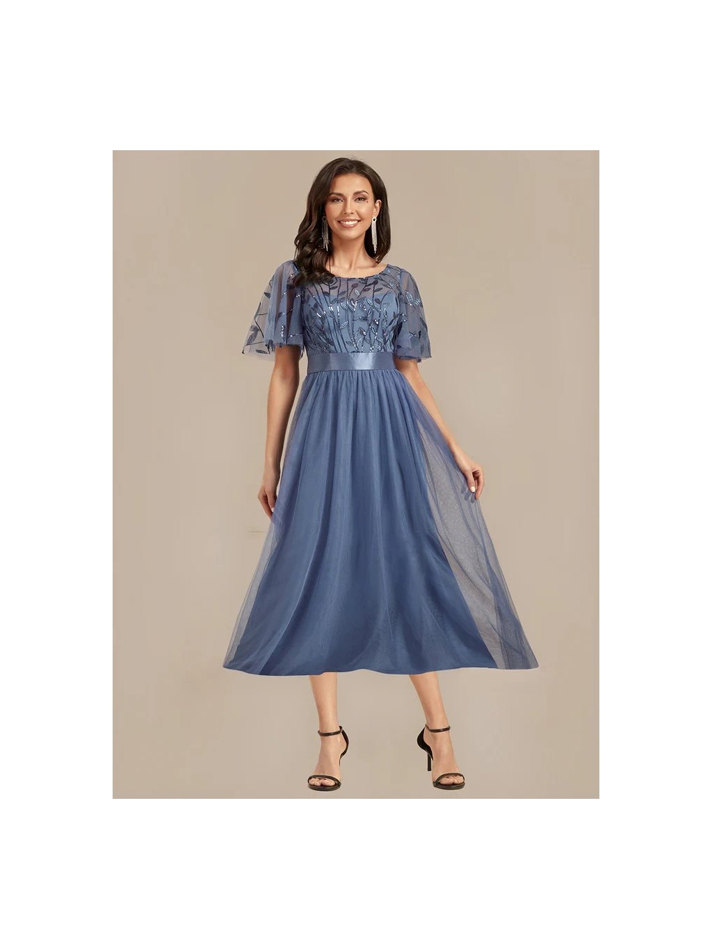 Jemné tylové šaty s kulatým výstřihem ,dokonalý jednoduchý design. Šaty mají midi délku a rovnou sukni, vršek vyšívaný s jemným odleskem.